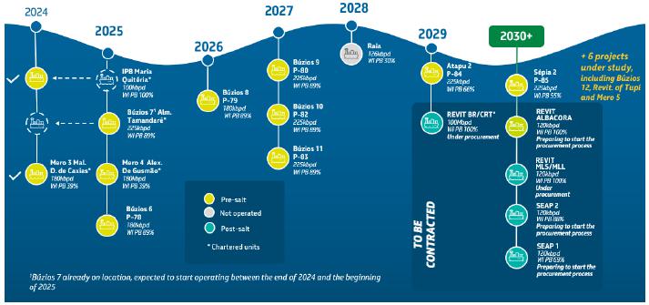 Ten new production systems will be implemented by 2029, with state-of-the-art technologies that allow for greater efficiency and lower emissions, nine of which have already been contracted. There are also five projects being implemented beyond 2029 and another six projects under study. Petrobras is the operator of all these projects, except for Raia, which is operated by Equinor.