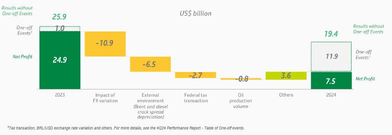 “Petrobras' result in 2024 was mainly impacted by an item of an accounting nature: the exchange rate variation on debts between Petrobras and its subsidiaries abroad. These are financial transactions between companies in the same group, which generate opposite effects that in the end balance out economically. This is because the currency variation in these transactions enters the net result of the Holding in Brazil and negatively impacted the profit for 2024. At the same time, there was a direct positive impact on equity.”