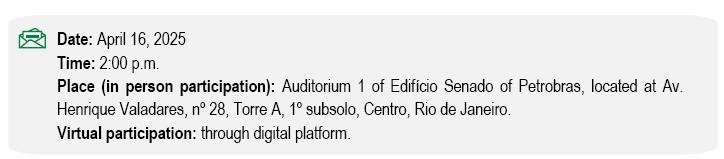 Place (in person participation): Auditorium 1 of Edifício Senado of Petrobras, located at Av. Henrique Valadares, nº 28, Torre A, 1º subsolo, Centro, Rio de Janeiro.