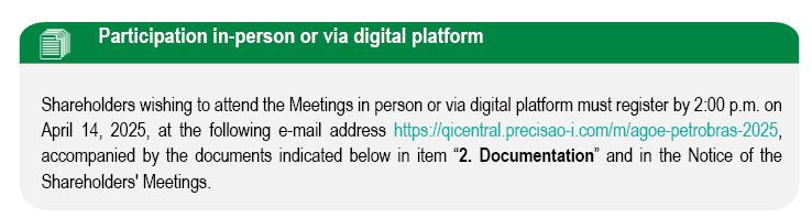Shareholders who want to participate in person or via digital platform in the Meetings must register by 2:00 p.m. of April 14, 2025 at https://qicentral.precisao-i.com/m/agoe-petrobras-2025, by sending the documents listed below in the “Documentation” section. Only those who choose to participate in person must present the documentation, exceptionally, until the date of the Meetings, and the Company will be able to receive them starting at 11:00 a.m., at the venue of the meeting.