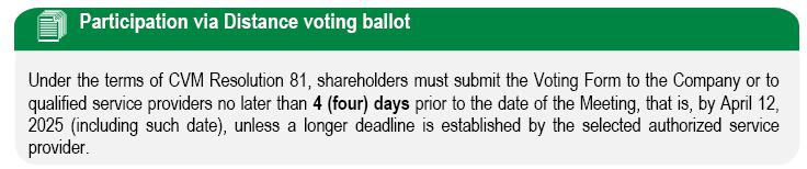 The detailed instructions referring to all forms of participation can be found in the “Instructions for Participation at the Meetings” and “Instructions for Participation via Distance Voting Ballot” sections, and the Manual for Participation in Meetings, available on the websites of the Company (http://www.petrobras.com.br/ir) and CVM (http://www.cvm.gov.br).