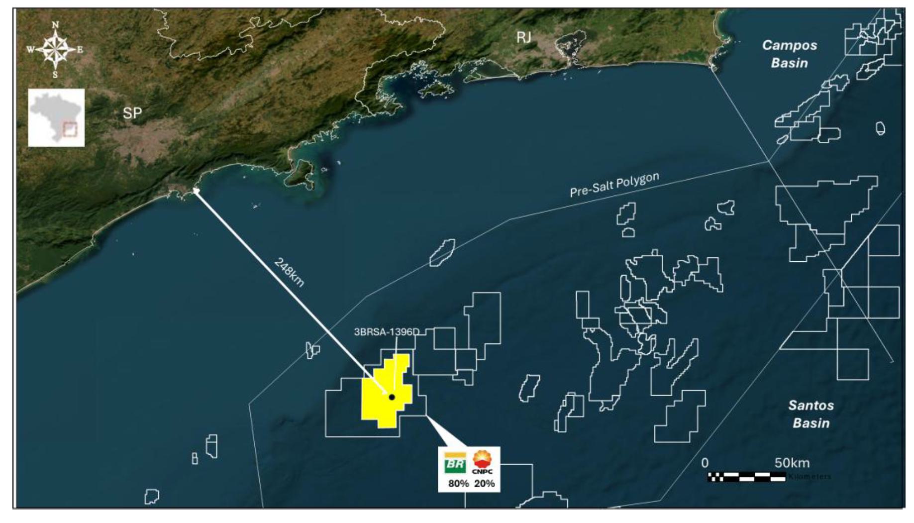 Well 3-BRSA-1396D-SPS is located 248 km from the city of Santos-SP, at a water depth of 1,952 meters. The drilling of this well has ended, with a oil-bearing interval confirmed through electrical logs, gas shows, and fluid sampling.