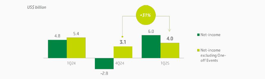 In 1Q25, the Adjusted EBITDA excluding one-off events reached US$ 10.7 billion, while net income, also excluding one-off events, was US$ 4.0 billion.