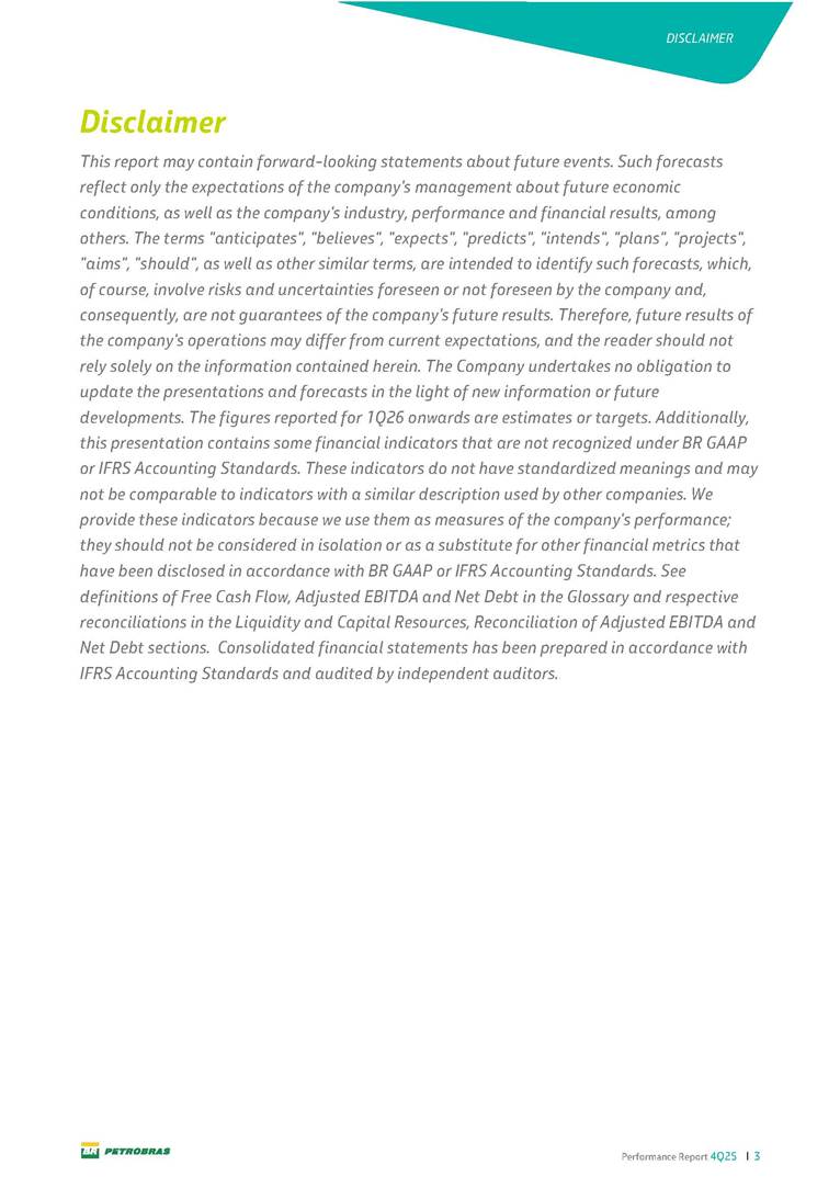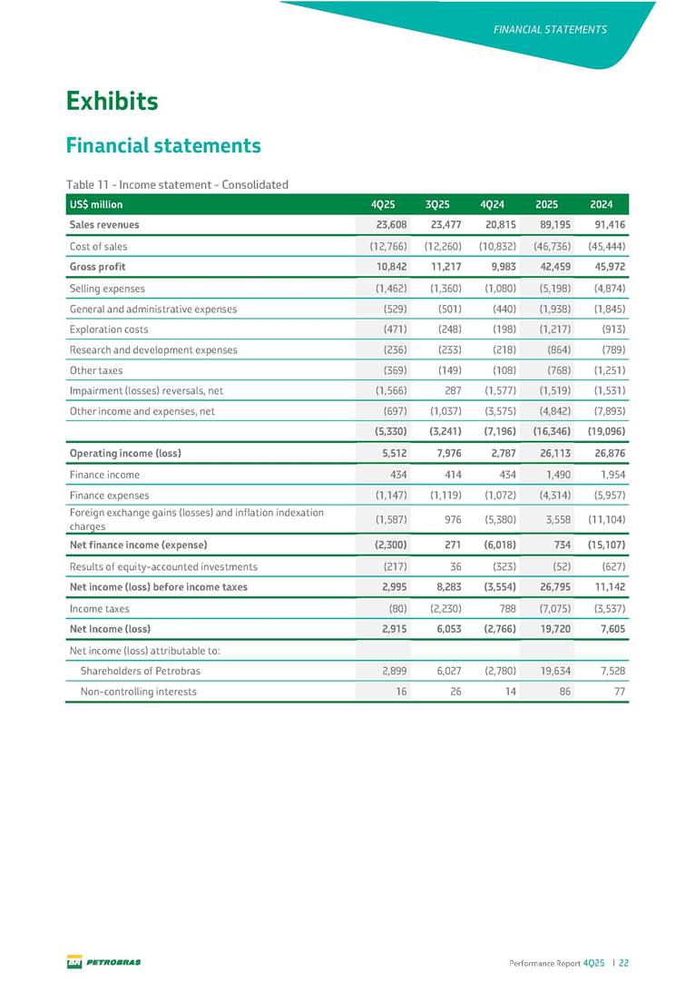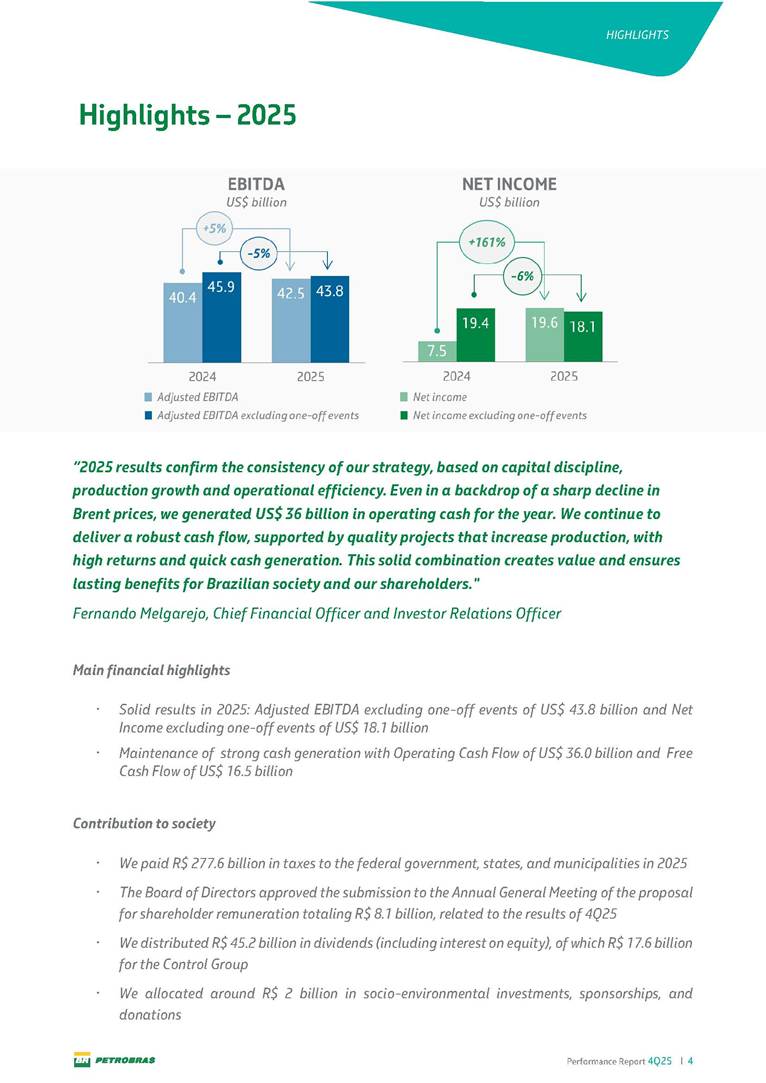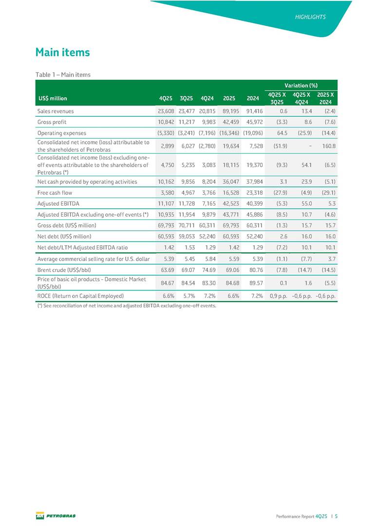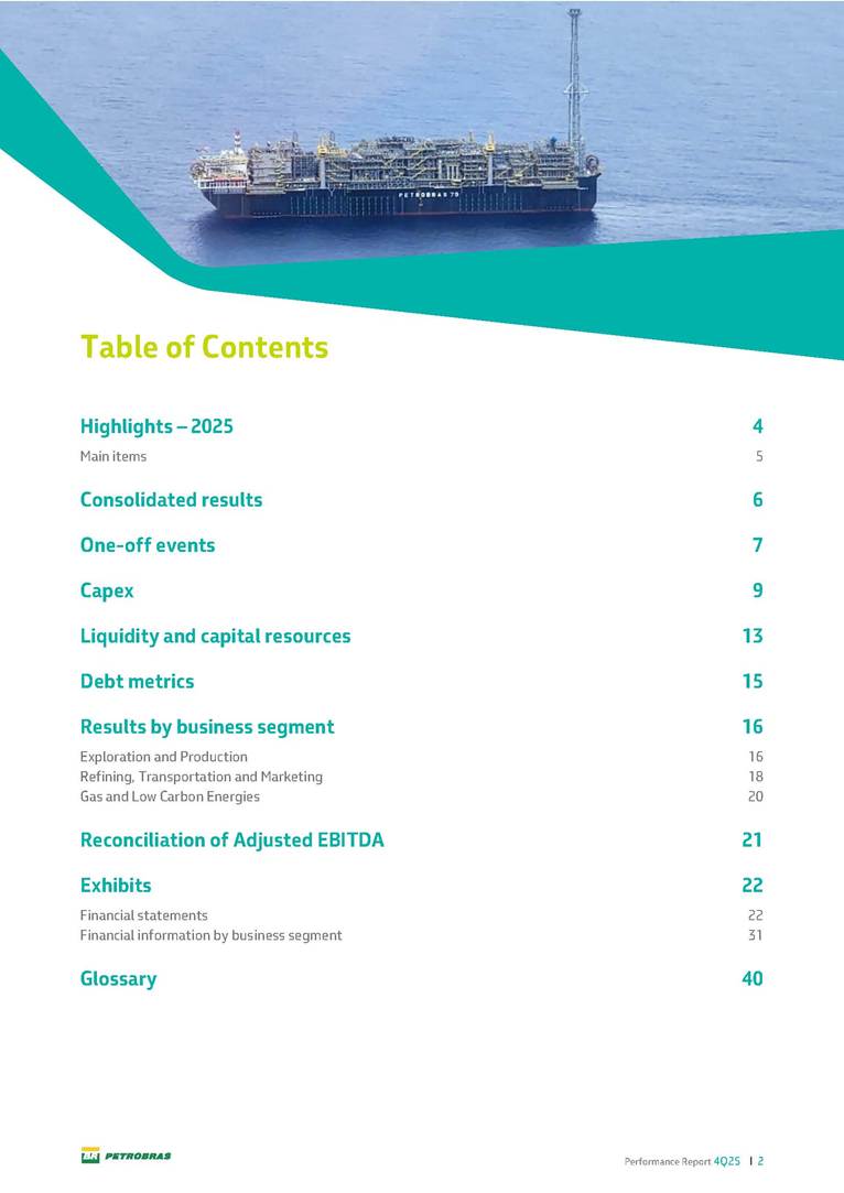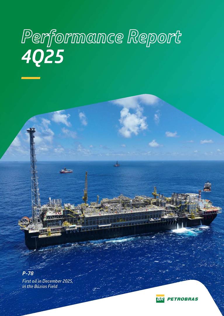 Performance Report4Q25 — P-78 First oil in December 2025, in the Búzios Field Performance Report 4Q25 I 2 DISCLAIMER Table of Contents Highlights – 2025 4 Main items 5 Consolidated results 6 One-off events 7 Capex 9 Liquidity and capital resources 13 Debt metrics 15 Results by business segment 16 Exploration and Production 16 Refining, Transportation and Marketing 18 Gas and Low Carbon Energies 20 Reconciliation of Adjusted EBITDA 21 Exhibits 22 Financial statements 22 Financial information by business segment 31 Glossary 40 Performance Report 4Q25 I 3 DISCLAIMER Disclaimer This report may contain forward-looking statements about future events. Such forecasts reflect only the expectations of the company's management about future economic conditions, as well as the company's industry, performance and financial results, among others. The terms "anticipates", "believes", "expects", "predicts", "intends", "plans", "projects", "aims", "should", as well as other similar terms, are intended to identify such forecasts, which, of course, involve risks and uncertainties foreseen or not foreseen by the company and, consequently, are not guarantees of the company's future results. Therefore, future results of the company's operations may differ from current expectations, and the reader should not rely solely on the information contained herein. The Company undertakes no obligation to update the presentations and forecasts in the light of new information or future developments. The figures reported for 1Q26 onwards are estimates or targets. Additionally, this presentation contains some financial indicators that are not recognized under BR GAAP or IFRS Accounting Standards. These indicators do not have standardized meanings and may not be comparable to indicators with a similar description used by other companies. We provide these indicators because we use them as measures of the company's performance; they should not be considered in isolation or as a substitute for other financial metrics that have been disclosed in accordance with BR GAAP or IFRS Accounting Standards. See definitions of Free Cash Flow, Adjusted EBITDA and Net Debt in the Glossary and respective reconciliations in the Liquidity and Capital Resources, Reconciliation of Adjusted EBITDA and Net Debt sections. Consolidated financial statements has been prepared in accordance with IFRS Accounting Standards and audited by independent auditors. Performance Report 4Q25 I 4 HIGHLIGHTS Highlights – 2025 “2025 results confirm the consistency of our strategy, based on capital discipline, production growth and operational efficiency. Even in a backdrop of a sharp decline in Brent prices, we generated US$ 36 billion in operating cash for the year. We continue to deliver a robust cash flow, supported by quality projects that increase production, with high returns and quick cash generation. This solid combination creates value and ensures lasting benefits for Brazilian society and our shareholders." Fernando Melgarejo, Chief Financial Officer and Investor Relations Officer Main financial highlights • Solid results in 2025: Adjusted EBITDA excluding one-off events of US$ 43.8 billion and Net Income excluding one-off events of US$ 18.1 billion • Maintenance of strong cash generation with Operating Cash Flow of US$ 36.0 billion and Free Cash Flow of US$ 16.5 billion Contribution to society • We paid R$ 277.6 billion in taxes to the federal government, states, and municipalities in 2025 • The Board of Directors approved the submission to the Annual General Meeting of the proposal for shareholder remuneration totaling R$ 8.1 billion, related to the results of 4Q25 • We distributed R$ 45.2 billion in dividends (including interest on equity), of which R$ 17.6 billion for the Control Group • We allocated around R$ 2 billion in socio-environmental investments, sponsorships, and donations Performance Report 4Q25 I 5 HIGHLIGHTS Main items Table 1 – Main items Variation (%) US$ million 4Q25 3Q25 4Q24 2025 2024 4Q25 X 3Q25 4Q25 X 4Q24 2025 X 2024 Sales revenues 23,608 23,477 20,815 89,195 91,416 0.6 13.4 (2.4) Gross profit 10,842 11,217 9,983 42,459 45,972 (3.3) 8.6 (7.6) Operating expenses (5,330) (3,241) (7,196) (16,346) (19,096) 64.5 (25.9) (14.4) Consolidated net income (loss) attributable to the shareholders of Petrobras 2,899 6,027 (2,780) 19,634 7,528 (51.9) − 160.8 Consolidated net income (loss) excluding one-off events attributable to the shareholders of Petrobras (*) 4,750 5,235 3,083 18,115 19,370 (9.3) 54.1 (6.5) Net cash provided by operating activities 10,162 9,856 8,204 36,047 37,984 3.1 23.9 (5.1) Free cash flow 3,580 4,967 3,766 16,528 23,318 (27.9) (4.9) (29.1) Adjusted EBITDA 11,107 11,728 7,165 42,523 40,399 (5.3) 55.0 5.3 Adjusted EBITDA excluding one-off events (*) 10,935 11,954 9,879 43,771 45,886 (8.5) 10.7 (4.6) Gross debt (US$ million) 69,793 70,711 60,311 69,793 60,311 (1.3) 15.7 15.7 Net debt (US$ million) 60,593 59,053 52,240 60,593 52,240 2.6 16.0 16.0 Net debt/LTM Adjusted EBITDA ratio 1.42 1.53 1.29 1.42 1.29 (7.2) 10.1 10.1 Average commercial selling rate for U.S. dollar 5.39 5.45 5.84 5.59 5.39 (1.1) (7.7) 3.7 Brent crude (US$/bbl) 63.69 69.07 74.69 69.06 80.76 (7.8) (14.7) (14.5) Price of basic oil products - Domestic Market (US$/bbl) 84.67 84.54 83.30 84.68 89.57 0.1 1.6 (5.5) ROCE (Return on Capital Employed) 6.6% 5.7% 7.2% 6.6% 7.2% 0,9 p.p. -0,6 p.p. -0,6 p.p. (*) See reconciliation of net income and adjusted EBITDA excluding one-off events. Performance Report 4Q25 I 6 CONSOLIDATE RESULTS Consolidated results In 2025, we delivered solid financial results, even in the face of a challenging backdrop, marked by a 14% drop in Brent prices compared to the previous year. This performance was mainly driven by excellent operational results, especially the 11% increase in total oil and gas production. As a result, we achieved an adjusted EBITDA of US$ 43.8 billion and Net Income of US$ 18.1 billion, both ex