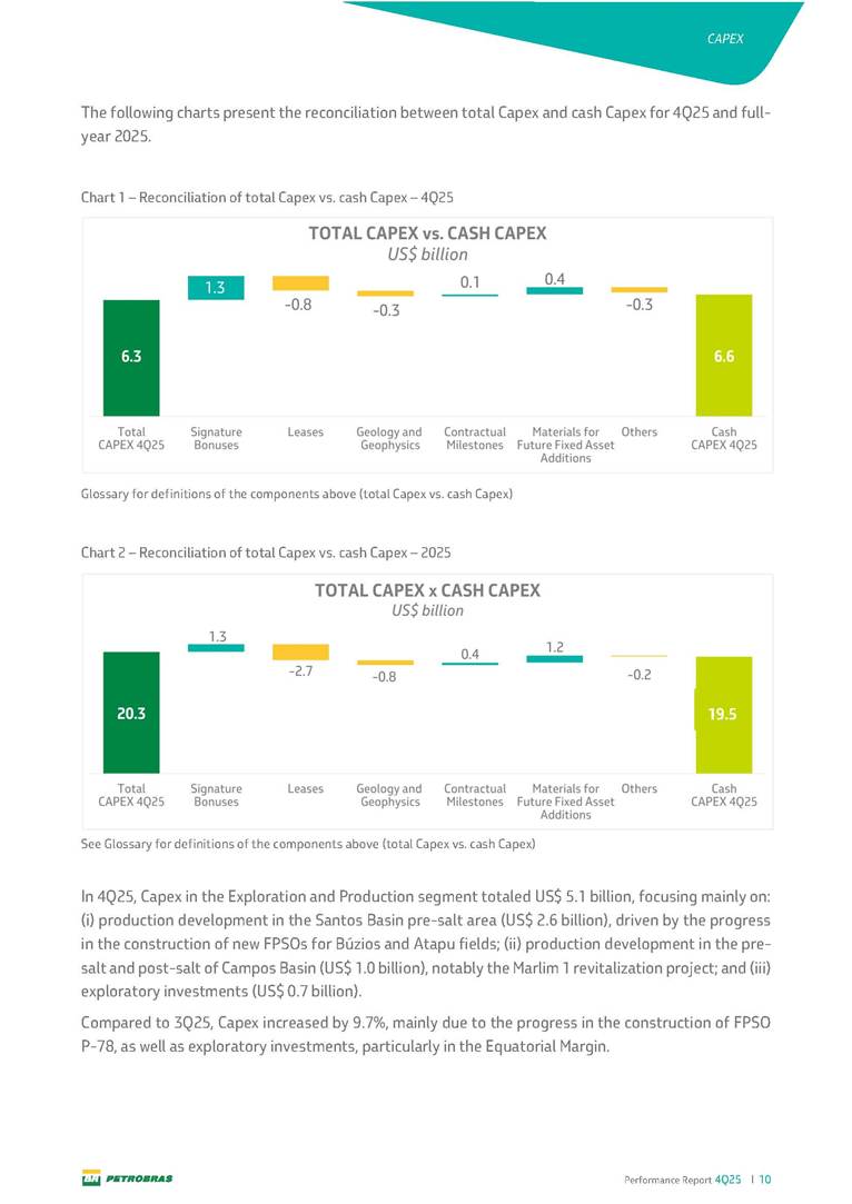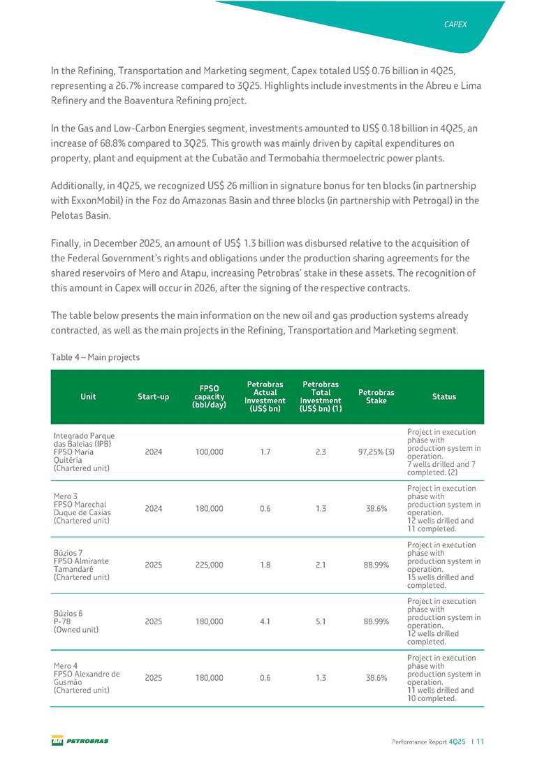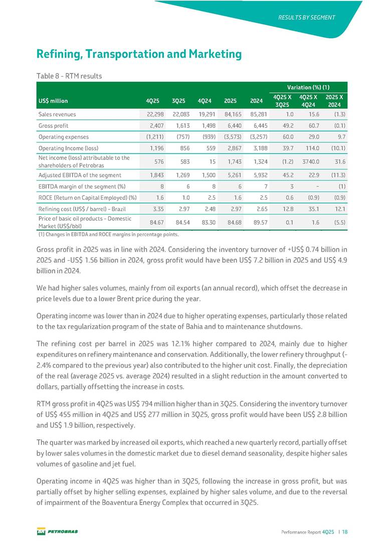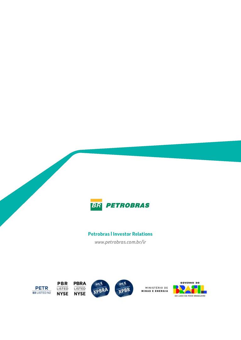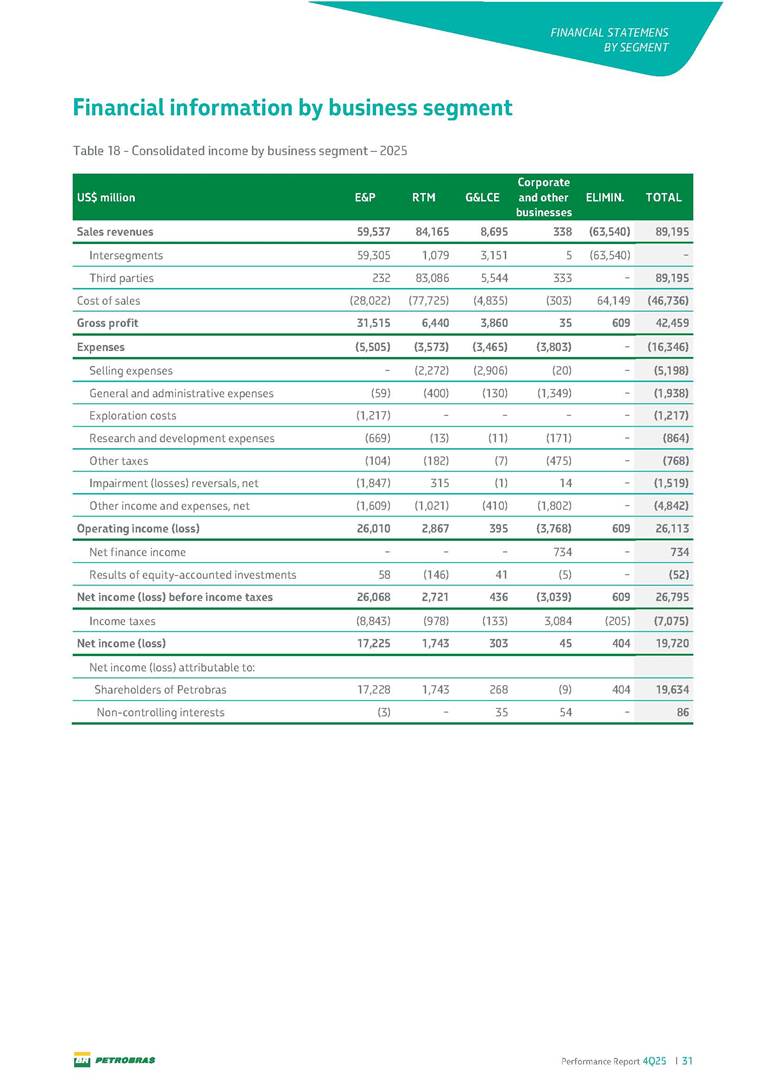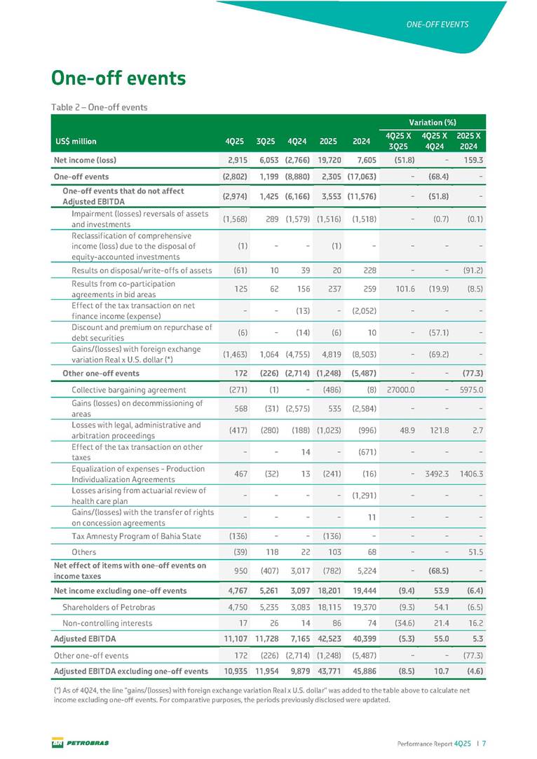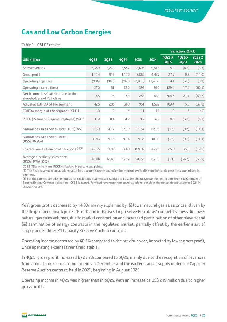 Performance Report4Q25 — P-78 First oil in December 2025, in the Búzios Field Performance Report 4Q25 I 2 DISCLAIMER Table of Contents Highlights – 2025 4 Main items 5 Consolidated results 6 One-off events 7 Capex 9 Liquidity and capital resources 13 Debt metrics 15 Results by business segment 16 Exploration and Production 16 Refining, Transportation and Marketing 18 Gas and Low Carbon Energies 20 Reconciliation of Adjusted EBITDA 21 Exhibits 22 Financial statements 22 Financial information by business segment 31 Glossary 40 Performance Report 4Q25 I 3 DISCLAIMER Disclaimer This report may contain forward-looking statements about future events. Such forecasts reflect only the expectations of the company's management about future economic conditions, as well as the company's industry, performance and financial results, among others. The terms "anticipates", "believes", "expects", "predicts", "intends", "plans", "projects", "aims", "should", as well as other similar terms, are intended to identify such forecasts, which, of course, involve risks and uncertainties foreseen or not foreseen by the company and, consequently, are not guarantees of the company's future results. Therefore, future results of the company's operations may differ from current expectations, and the reader should not rely solely on the information contained herein. The Company undertakes no obligation to update the presentations and forecasts in the light of new information or future developments. The figures reported for 1Q26 onwards are estimates or targets. Additionally, this presentation contains some financial indicators that are not recognized under BR GAAP or IFRS Accounting Standards. These indicators do not have standardized meanings and may not be comparable to indicators with a similar description used by other companies. We provide these indicators because we use them as measures of the company's performance; they should not be considered in isolation or as a substitute for other financial metrics that have been disclosed in accordance with BR GAAP or IFRS Accounting Standards. See definitions of Free Cash Flow, Adjusted EBITDA and Net Debt in the Glossary and respective reconciliations in the Liquidity and Capital Resources, Reconciliation of Adjusted EBITDA and Net Debt sections. Consolidated financial statements has been prepared in accordance with IFRS Accounting Standards and audited by independent auditors. Performance Report 4Q25 I 4 HIGHLIGHTS Highlights – 2025 “2025 results confirm the consistency of our strategy, based on capital discipline, production growth and operational efficiency. Even in a backdrop of a sharp decline in Brent prices, we generated US$ 36 billion in operating cash for the year. We continue to deliver a robust cash flow, supported by quality projects that increase production, with high returns and quick cash generation. This solid combination creates value and ensures lasting benefits for Brazilian society and our shareholders." Fernando Melgarejo, Chief Financial Officer and Investor Relations Officer Main financial highlights • Solid results in 2025: Adjusted EBITDA excluding one-off events of US$ 43.8 billion and Net Income excluding one-off events of US$ 18.1 billion • Maintenance of strong cash generation with Operating Cash Flow of US$ 36.0 billion and Free Cash Flow of US$ 16.5 billion Contribution to society • We paid R$ 277.6 billion in taxes to the federal government, states, and municipalities in 2025 • The Board of Directors approved the submission to the Annual General Meeting of the proposal for shareholder remuneration totaling R$ 8.1 billion, related to the results of 4Q25 • We distributed R$ 45.2 billion in dividends (including interest on equity), of which R$ 17.6 billion for the Control Group • We allocated around R$ 2 billion in socio-environmental investments, sponsorships, and donations Performance Report 4Q25 I 5 HIGHLIGHTS Main items Table 1 – Main items Variation (%) US$ million 4Q25 3Q25 4Q24 2025 2024 4Q25 X 3Q25 4Q25 X 4Q24 2025 X 2024 Sales revenues 23,608 23,477 20,815 89,195 91,416 0.6 13.4 (2.4) Gross profit 10,842 11,217 9,983 42,459 45,972 (3.3) 8.6 (7.6) Operating expenses (5,330) (3,241) (7,196) (16,346) (19,096) 64.5 (25.9) (14.4) Consolidated net income (loss) attributable to the shareholders of Petrobras 2,899 6,027 (2,780) 19,634 7,528 (51.9) − 160.8 Consolidated net income (loss) excluding one-off events attributable to the shareholders of Petrobras (*) 4,750 5,235 3,083 18,115 19,370 (9.3) 54.1 (6.5) Net cash provided by operating activities 10,162 9,856 8,204 36,047 37,984 3.1 23.9 (5.1) Free cash flow 3,580 4,967 3,766 16,528 23,318 (27.9) (4.9) (29.1) Adjusted EBITDA 11,107 11,728 7,165 42,523 40,399 (5.3) 55.0 5.3 Adjusted EBITDA excluding one-off events (*) 10,935 11,954 9,879 43,771 45,886 (8.5) 10.7 (4.6) Gross debt (US$ million) 69,793 70,711 60,311 69,793 60,311 (1.3) 15.7 15.7 Net debt (US$ million) 60,593 59,053 52,240 60,593 52,240 2.6 16.0 16.0 Net debt/LTM Adjusted EBITDA ratio 1.42 1.53 1.29 1.42 1.29 (7.2) 10.1 10.1 Average commercial selling rate for U.S. dollar 5.39 5.45 5.84 5.59 5.39 (1.1) (7.7) 3.7 Brent crude (US$/bbl) 63.69 69.07 74.69 69.06 80.76 (7.8) (14.7) (14.5) Price of basic oil products - Domestic Market (US$/bbl) 84.67 84.54 83.30 84.68 89.57 0.1 1.6 (5.5) ROCE (Return on Capital Employed) 6.6% 5.7% 7.2% 6.6% 7.2% 0,9 p.p. -0,6 p.p. -0,6 p.p. (*) See reconciliation of net income and adjusted EBITDA excluding one-off events. Performance Report 4Q25 I 6 CONSOLIDATE RESULTS Consolidated results In 2025, we delivered solid financial results, even in the face of a challenging backdrop, marked by a 14% drop in Brent prices compared to the previous year. This performance was mainly driven by excellent operational results, especially the 11% increase in total oil and gas production. As a result, we achieved an adjusted EBITDA of US$ 43.8 billion and Net Income of US$ 18.1 billion, both ex
