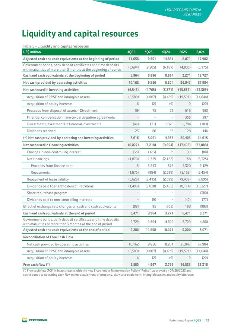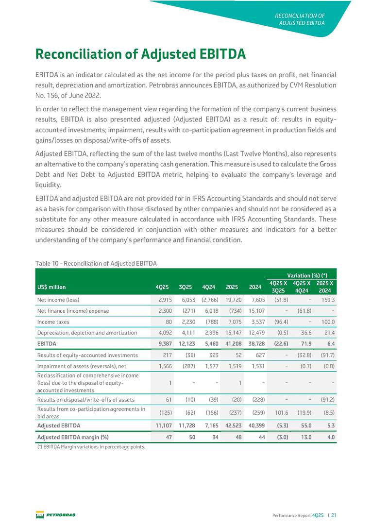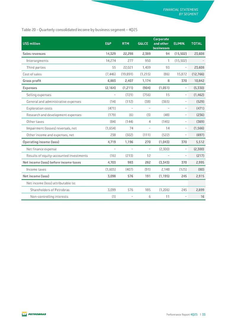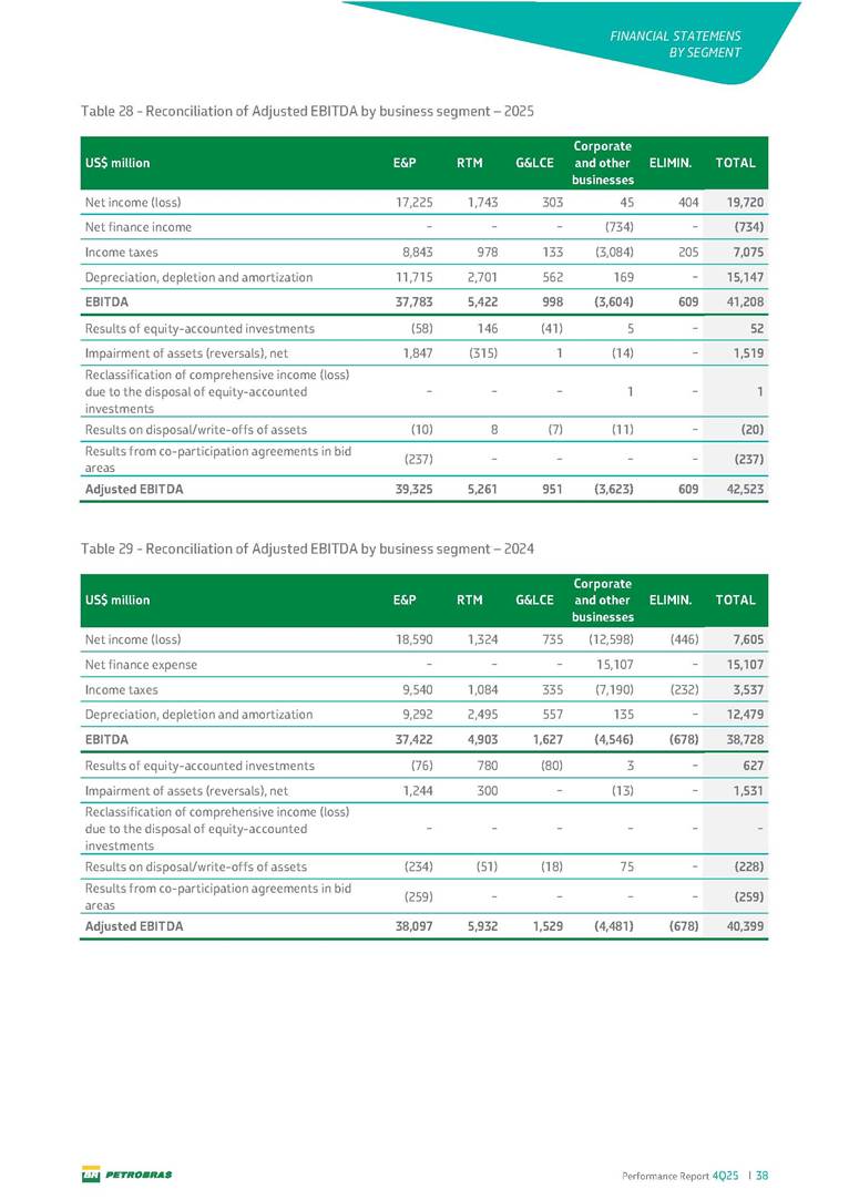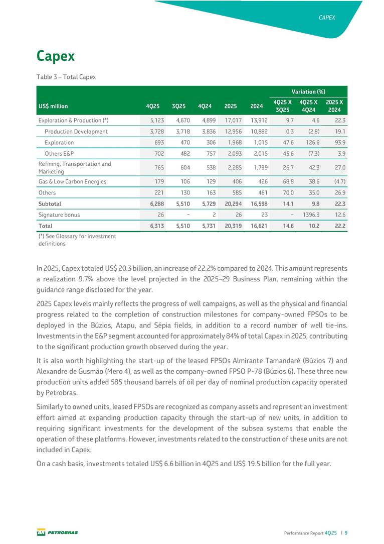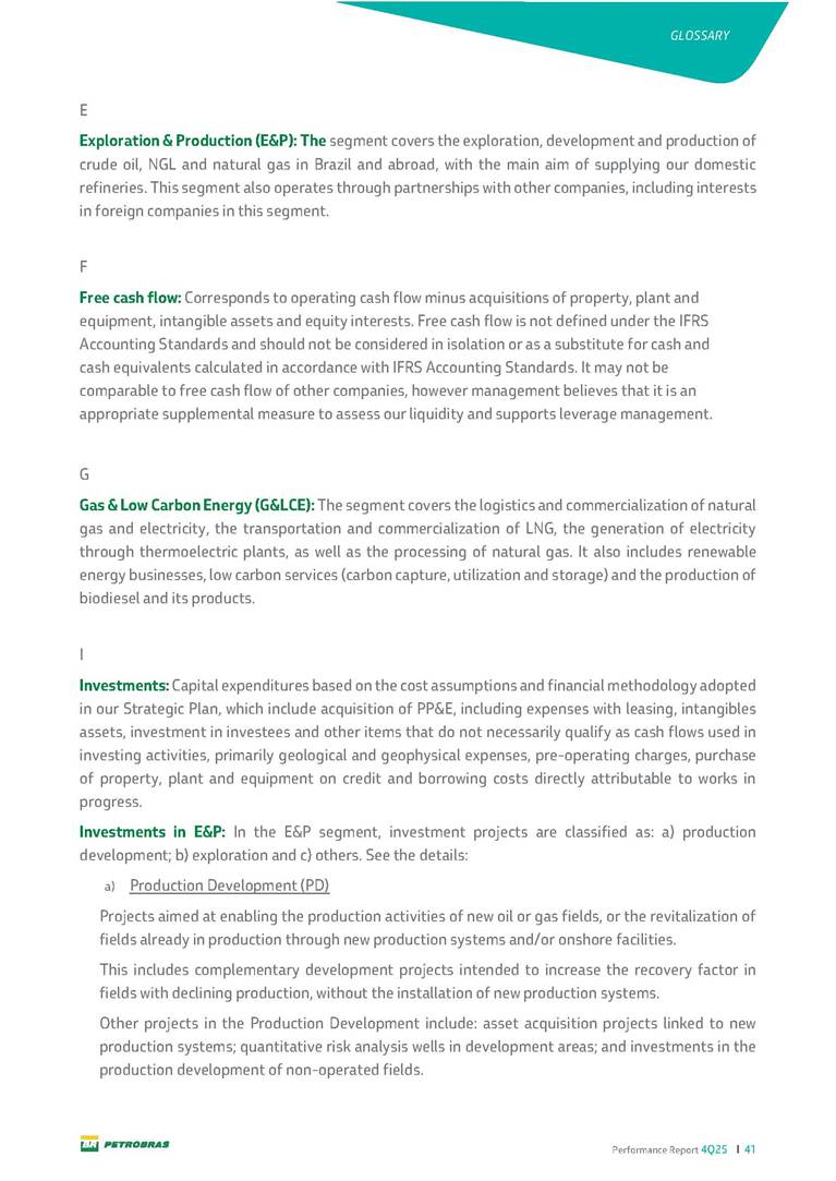 Performance Report4Q25 — P-78 First oil in December 2025, in the Búzios Field Performance Report 4Q25 I 2 DISCLAIMER Table of Contents Highlights – 2025 4 Main items 5 Consolidated results 6 One-off events 7 Capex 9 Liquidity and capital resources 13 Debt metrics 15 Results by business segment 16 Exploration and Production 16 Refining, Transportation and Marketing 18 Gas and Low Carbon Energies 20 Reconciliation of Adjusted EBITDA 21 Exhibits 22 Financial statements 22 Financial information by business segment 31 Glossary 40 Performance Report 4Q25 I 3 DISCLAIMER Disclaimer This report may contain forward-looking statements about future events. Such forecasts reflect only the expectations of the company's management about future economic conditions, as well as the company's industry, performance and financial results, among others. The terms "anticipates", "believes", "expects", "predicts", "intends", "plans", "projects", "aims", "should", as well as other similar terms, are intended to identify such forecasts, which, of course, involve risks and uncertainties foreseen or not foreseen by the company and, consequently, are not guarantees of the company's future results. Therefore, future results of the company's operations may differ from current expectations, and the reader should not rely solely on the information contained herein. The Company undertakes no obligation to update the presentations and forecasts in the light of new information or future developments. The figures reported for 1Q26 onwards are estimates or targets. Additionally, this presentation contains some financial indicators that are not recognized under BR GAAP or IFRS Accounting Standards. These indicators do not have standardized meanings and may not be comparable to indicators with a similar description used by other companies. We provide these indicators because we use them as measures of the company's performance; they should not be considered in isolation or as a substitute for other financial metrics that have been disclosed in accordance with BR GAAP or IFRS Accounting Standards. See definitions of Free Cash Flow, Adjusted EBITDA and Net Debt in the Glossary and respective reconciliations in the Liquidity and Capital Resources, Reconciliation of Adjusted EBITDA and Net Debt sections. Consolidated financial statements has been prepared in accordance with IFRS Accounting Standards and audited by independent auditors. Performance Report 4Q25 I 4 HIGHLIGHTS Highlights – 2025 “2025 results confirm the consistency of our strategy, based on capital discipline, production growth and operational efficiency. Even in a backdrop of a sharp decline in Brent prices, we generated US$ 36 billion in operating cash for the year. We continue to deliver a robust cash flow, supported by quality projects that increase production, with high returns and quick cash generation. This solid combination creates value and ensures lasting benefits for Brazilian society and our shareholders." Fernando Melgarejo, Chief Financial Officer and Investor Relations Officer Main financial highlights • Solid results in 2025: Adjusted EBITDA excluding one-off events of US$ 43.8 billion and Net Income excluding one-off events of US$ 18.1 billion • Maintenance of strong cash generation with Operating Cash Flow of US$ 36.0 billion and Free Cash Flow of US$ 16.5 billion Contribution to society • We paid R$ 277.6 billion in taxes to the federal government, states, and municipalities in 2025 • The Board of Directors approved the submission to the Annual General Meeting of the proposal for shareholder remuneration totaling R$ 8.1 billion, related to the results of 4Q25 • We distributed R$ 45.2 billion in dividends (including interest on equity), of which R$ 17.6 billion for the Control Group • We allocated around R$ 2 billion in socio-environmental investments, sponsorships, and donations Performance Report 4Q25 I 5 HIGHLIGHTS Main items Table 1 – Main items Variation (%) US$ million 4Q25 3Q25 4Q24 2025 2024 4Q25 X 3Q25 4Q25 X 4Q24 2025 X 2024 Sales revenues 23,608 23,477 20,815 89,195 91,416 0.6 13.4 (2.4) Gross profit 10,842 11,217 9,983 42,459 45,972 (3.3) 8.6 (7.6) Operating expenses (5,330) (3,241) (7,196) (16,346) (19,096) 64.5 (25.9) (14.4) Consolidated net income (loss) attributable to the shareholders of Petrobras 2,899 6,027 (2,780) 19,634 7,528 (51.9) − 160.8 Consolidated net income (loss) excluding one-off events attributable to the shareholders of Petrobras (*) 4,750 5,235 3,083 18,115 19,370 (9.3) 54.1 (6.5) Net cash provided by operating activities 10,162 9,856 8,204 36,047 37,984 3.1 23.9 (5.1) Free cash flow 3,580 4,967 3,766 16,528 23,318 (27.9) (4.9) (29.1) Adjusted EBITDA 11,107 11,728 7,165 42,523 40,399 (5.3) 55.0 5.3 Adjusted EBITDA excluding one-off events (*) 10,935 11,954 9,879 43,771 45,886 (8.5) 10.7 (4.6) Gross debt (US$ million) 69,793 70,711 60,311 69,793 60,311 (1.3) 15.7 15.7 Net debt (US$ million) 60,593 59,053 52,240 60,593 52,240 2.6 16.0 16.0 Net debt/LTM Adjusted EBITDA ratio 1.42 1.53 1.29 1.42 1.29 (7.2) 10.1 10.1 Average commercial selling rate for U.S. dollar 5.39 5.45 5.84 5.59 5.39 (1.1) (7.7) 3.7 Brent crude (US$/bbl) 63.69 69.07 74.69 69.06 80.76 (7.8) (14.7) (14.5) Price of basic oil products - Domestic Market (US$/bbl) 84.67 84.54 83.30 84.68 89.57 0.1 1.6 (5.5) ROCE (Return on Capital Employed) 6.6% 5.7% 7.2% 6.6% 7.2% 0,9 p.p. -0,6 p.p. -0,6 p.p. (*) See reconciliation of net income and adjusted EBITDA excluding one-off events. Performance Report 4Q25 I 6 CONSOLIDATE RESULTS Consolidated results In 2025, we delivered solid financial results, even in the face of a challenging backdrop, marked by a 14% drop in Brent prices compared to the previous year. This performance was mainly driven by excellent operational results, especially the 11% increase in total oil and gas production. As a result, we achieved an adjusted EBITDA of US$ 43.8 billion and Net Income of US$ 18.1 billion, both ex