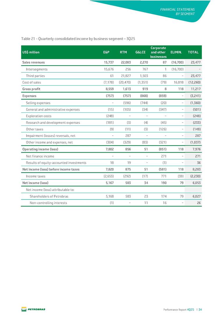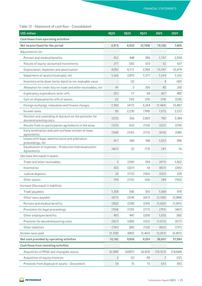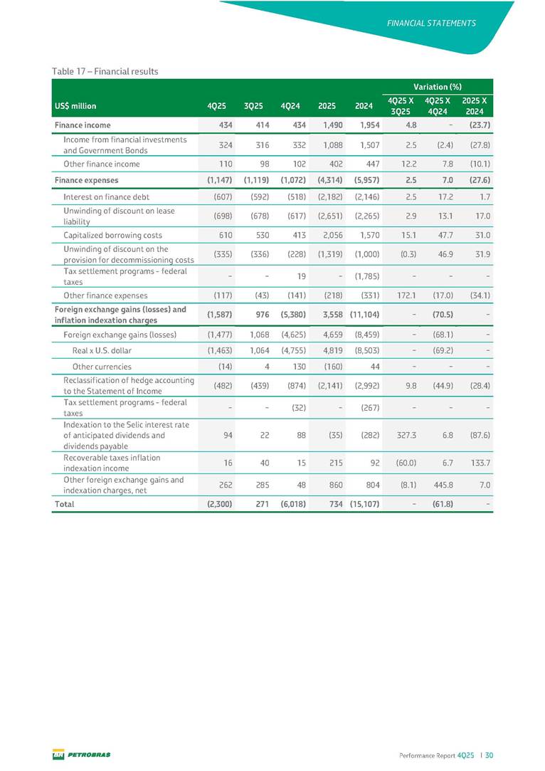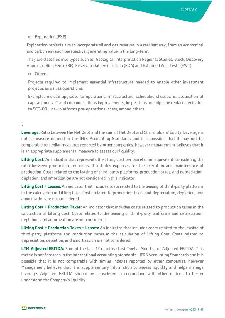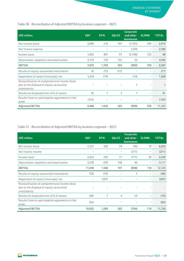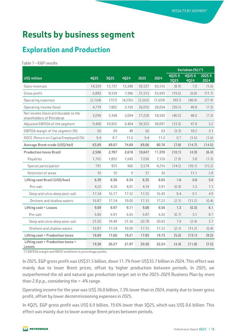 Performance Report4Q25 — P-78 First oil in December 2025, in the Búzios Field Performance Report 4Q25 I 2 DISCLAIMER Table of Contents Highlights – 2025 4 Main items 5 Consolidated results 6 One-off events 7 Capex 9 Liquidity and capital resources 13 Debt metrics 15 Results by business segment 16 Exploration and Production 16 Refining, Transportation and Marketing 18 Gas and Low Carbon Energies 20 Reconciliation of Adjusted EBITDA 21 Exhibits 22 Financial statements 22 Financial information by business segment 31 Glossary 40 Performance Report 4Q25 I 3 DISCLAIMER Disclaimer This report may contain forward-looking statements about future events. Such forecasts reflect only the expectations of the company's management about future economic conditions, as well as the company's industry, performance and financial results, among others. The terms "anticipates", "believes", "expects", "predicts", "intends", "plans", "projects", "aims", "should", as well as other similar terms, are intended to identify such forecasts, which, of course, involve risks and uncertainties foreseen or not foreseen by the company and, consequently, are not guarantees of the company's future results. Therefore, future results of the company's operations may differ from current expectations, and the reader should not rely solely on the information contained herein. The Company undertakes no obligation to update the presentations and forecasts in the light of new information or future developments. The figures reported for 1Q26 onwards are estimates or targets. Additionally, this presentation contains some financial indicators that are not recognized under BR GAAP or IFRS Accounting Standards. These indicators do not have standardized meanings and may not be comparable to indicators with a similar description used by other companies. We provide these indicators because we use them as measures of the company's performance; they should not be considered in isolation or as a substitute for other financial metrics that have been disclosed in accordance with BR GAAP or IFRS Accounting Standards. See definitions of Free Cash Flow, Adjusted EBITDA and Net Debt in the Glossary and respective reconciliations in the Liquidity and Capital Resources, Reconciliation of Adjusted EBITDA and Net Debt sections. Consolidated financial statements has been prepared in accordance with IFRS Accounting Standards and audited by independent auditors. Performance Report 4Q25 I 4 HIGHLIGHTS Highlights – 2025 “2025 results confirm the consistency of our strategy, based on capital discipline, production growth and operational efficiency. Even in a backdrop of a sharp decline in Brent prices, we generated US$ 36 billion in operating cash for the year. We continue to deliver a robust cash flow, supported by quality projects that increase production, with high returns and quick cash generation. This solid combination creates value and ensures lasting benefits for Brazilian society and our shareholders." Fernando Melgarejo, Chief Financial Officer and Investor Relations Officer Main financial highlights • Solid results in 2025: Adjusted EBITDA excluding one-off events of US$ 43.8 billion and Net Income excluding one-off events of US$ 18.1 billion • Maintenance of strong cash generation with Operating Cash Flow of US$ 36.0 billion and Free Cash Flow of US$ 16.5 billion Contribution to society • We paid R$ 277.6 billion in taxes to the federal government, states, and municipalities in 2025 • The Board of Directors approved the submission to the Annual General Meeting of the proposal for shareholder remuneration totaling R$ 8.1 billion, related to the results of 4Q25 • We distributed R$ 45.2 billion in dividends (including interest on equity), of which R$ 17.6 billion for the Control Group • We allocated around R$ 2 billion in socio-environmental investments, sponsorships, and donations Performance Report 4Q25 I 5 HIGHLIGHTS Main items Table 1 – Main items Variation (%) US$ million 4Q25 3Q25 4Q24 2025 2024 4Q25 X 3Q25 4Q25 X 4Q24 2025 X 2024 Sales revenues 23,608 23,477 20,815 89,195 91,416 0.6 13.4 (2.4) Gross profit 10,842 11,217 9,983 42,459 45,972 (3.3) 8.6 (7.6) Operating expenses (5,330) (3,241) (7,196) (16,346) (19,096) 64.5 (25.9) (14.4) Consolidated net income (loss) attributable to the shareholders of Petrobras 2,899 6,027 (2,780) 19,634 7,528 (51.9) − 160.8 Consolidated net income (loss) excluding one-off events attributable to the shareholders of Petrobras (*) 4,750 5,235 3,083 18,115 19,370 (9.3) 54.1 (6.5) Net cash provided by operating activities 10,162 9,856 8,204 36,047 37,984 3.1 23.9 (5.1) Free cash flow 3,580 4,967 3,766 16,528 23,318 (27.9) (4.9) (29.1) Adjusted EBITDA 11,107 11,728 7,165 42,523 40,399 (5.3) 55.0 5.3 Adjusted EBITDA excluding one-off events (*) 10,935 11,954 9,879 43,771 45,886 (8.5) 10.7 (4.6) Gross debt (US$ million) 69,793 70,711 60,311 69,793 60,311 (1.3) 15.7 15.7 Net debt (US$ million) 60,593 59,053 52,240 60,593 52,240 2.6 16.0 16.0 Net debt/LTM Adjusted EBITDA ratio 1.42 1.53 1.29 1.42 1.29 (7.2) 10.1 10.1 Average commercial selling rate for U.S. dollar 5.39 5.45 5.84 5.59 5.39 (1.1) (7.7) 3.7 Brent crude (US$/bbl) 63.69 69.07 74.69 69.06 80.76 (7.8) (14.7) (14.5) Price of basic oil products - Domestic Market (US$/bbl) 84.67 84.54 83.30 84.68 89.57 0.1 1.6 (5.5) ROCE (Return on Capital Employed) 6.6% 5.7% 7.2% 6.6% 7.2% 0,9 p.p. -0,6 p.p. -0,6 p.p. (*) See reconciliation of net income and adjusted EBITDA excluding one-off events. Performance Report 4Q25 I 6 CONSOLIDATE RESULTS Consolidated results In 2025, we delivered solid financial results, even in the face of a challenging backdrop, marked by a 14% drop in Brent prices compared to the previous year. This performance was mainly driven by excellent operational results, especially the 11% increase in total oil and gas production. As a result, we achieved an adjusted EBITDA of US$ 43.8 billion and Net Income of US$ 18.1 billion, both ex