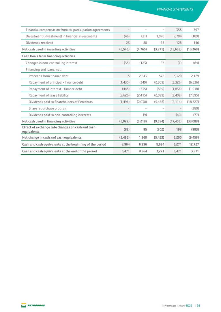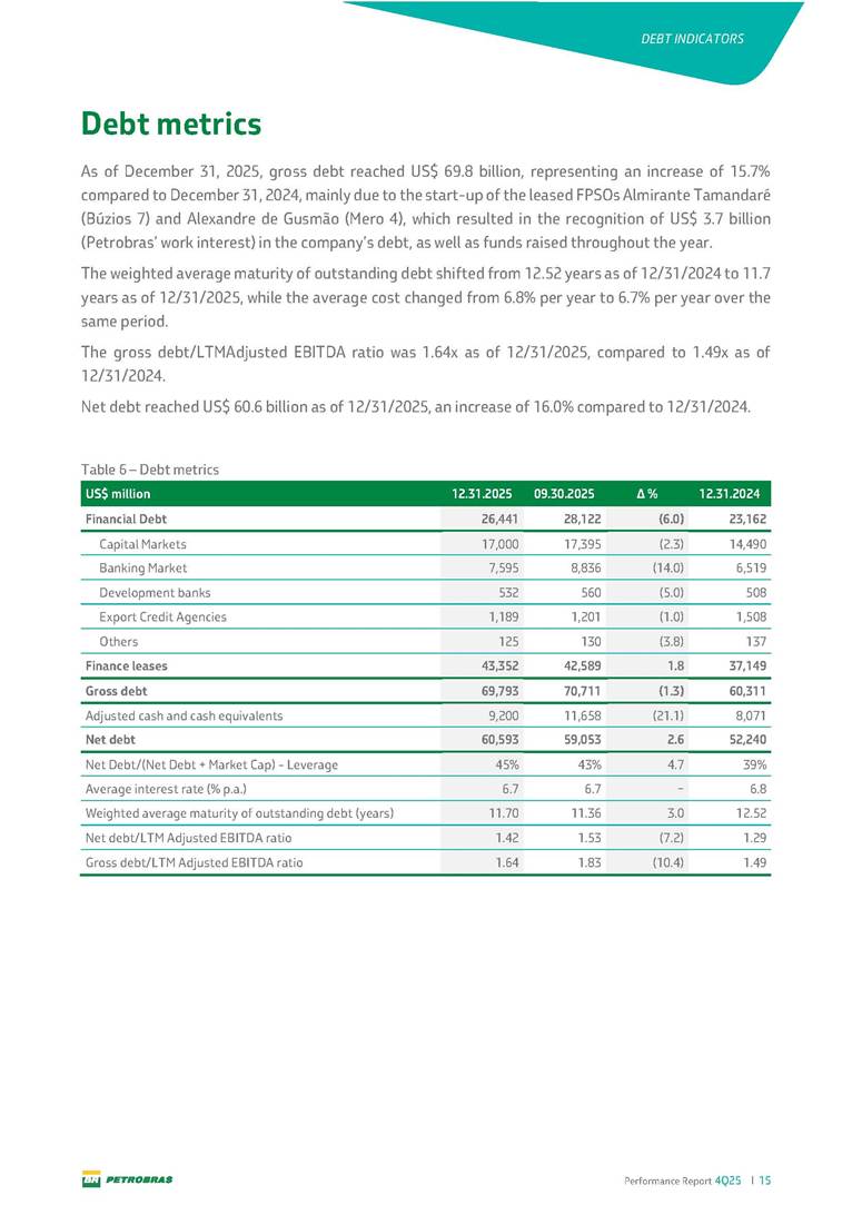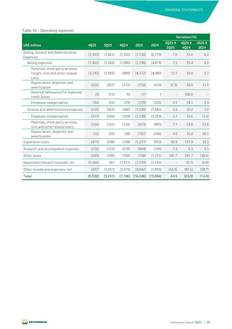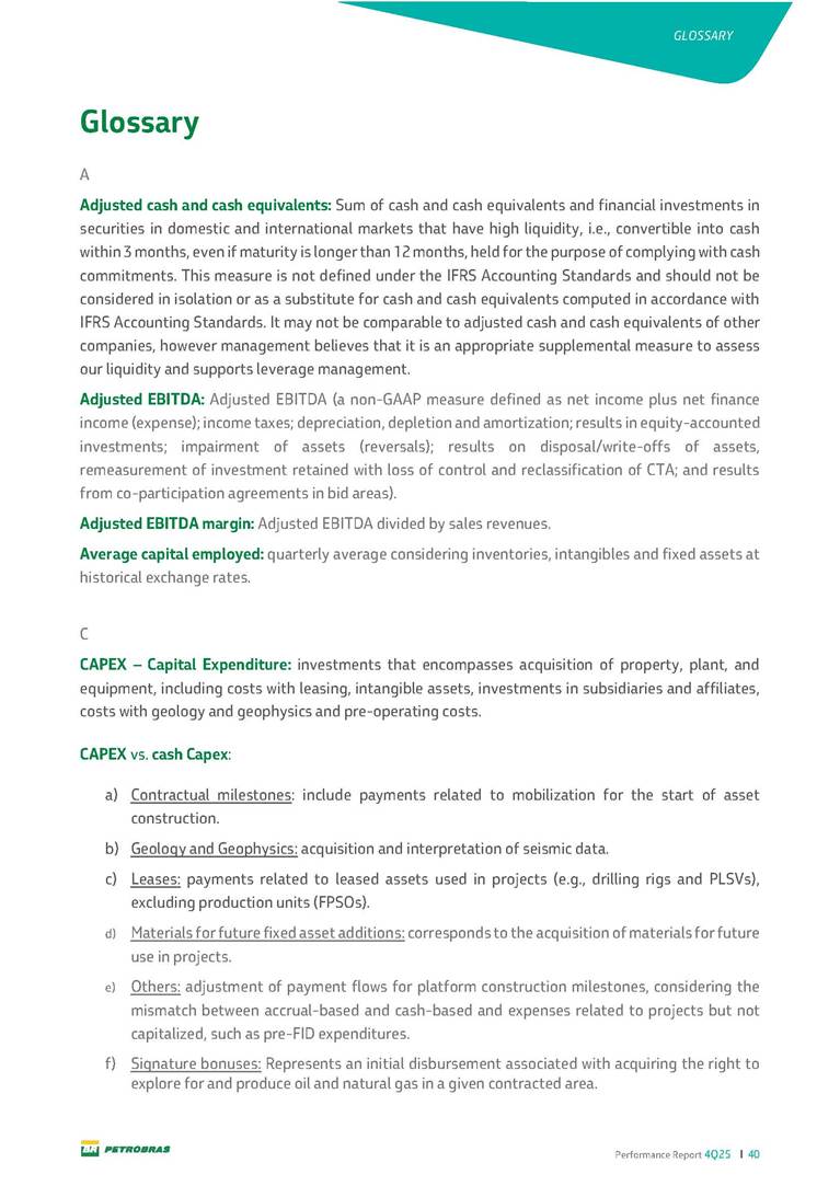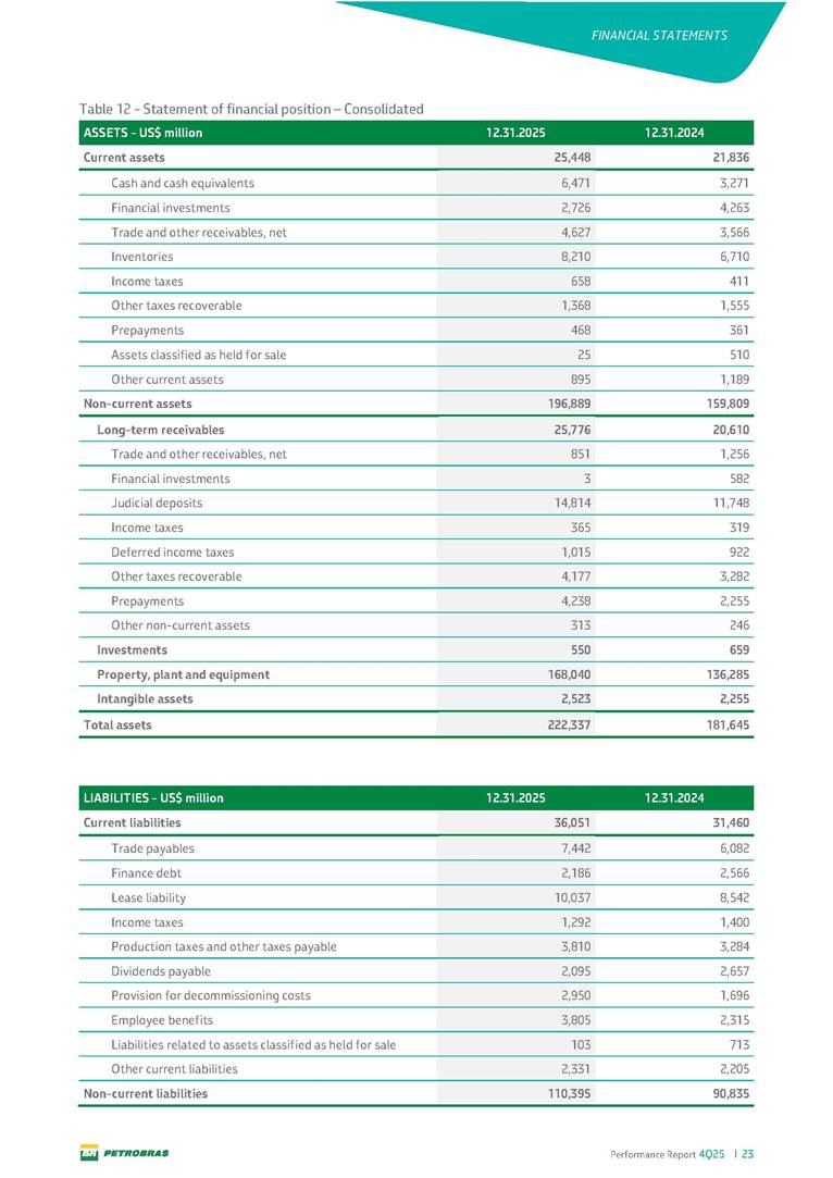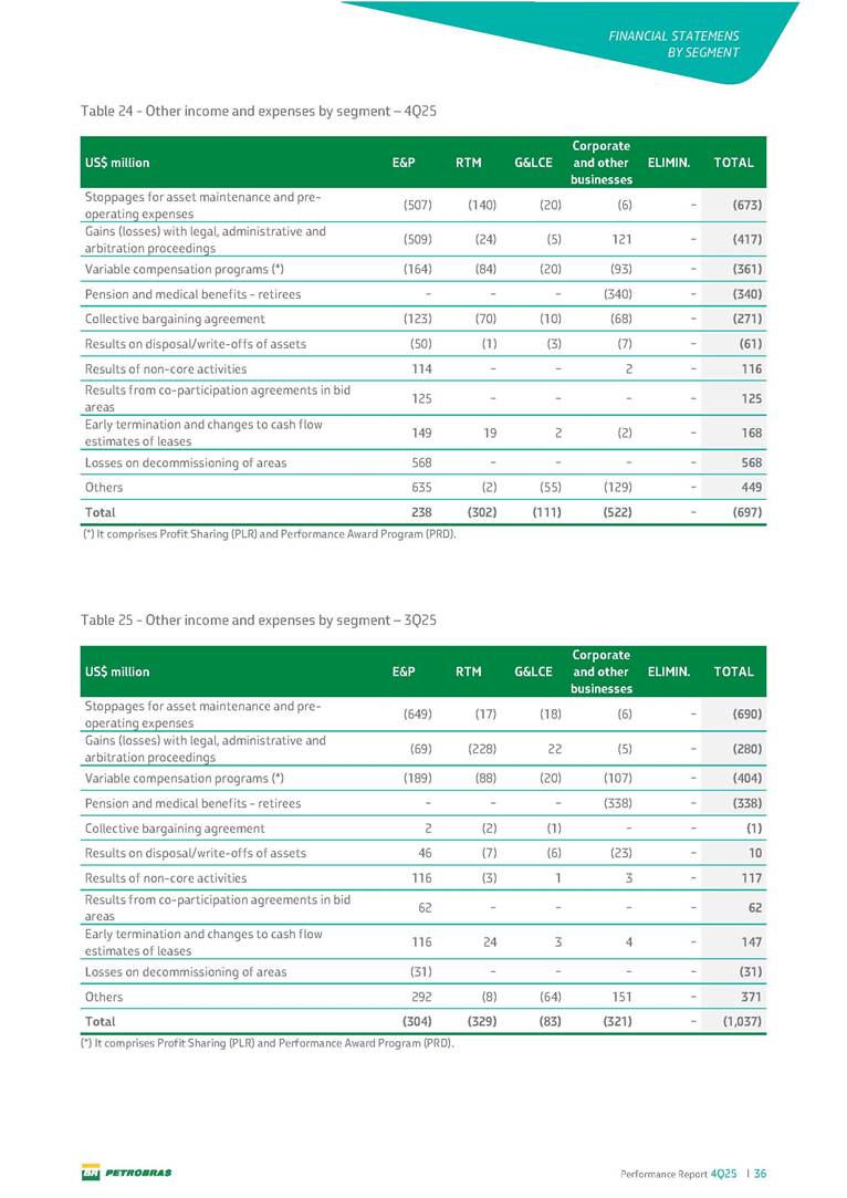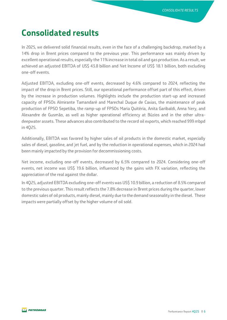 Performance Report4Q25 — P-78 First oil in December 2025, in the Búzios Field Performance Report 4Q25 I 2 DISCLAIMER Table of Contents Highlights – 2025 4 Main items 5 Consolidated results 6 One-off events 7 Capex 9 Liquidity and capital resources 13 Debt metrics 15 Results by business segment 16 Exploration and Production 16 Refining, Transportation and Marketing 18 Gas and Low Carbon Energies 20 Reconciliation of Adjusted EBITDA 21 Exhibits 22 Financial statements 22 Financial information by business segment 31 Glossary 40 Performance Report 4Q25 I 3 DISCLAIMER Disclaimer This report may contain forward-looking statements about future events. Such forecasts reflect only the expectations of the company's management about future economic conditions, as well as the company's industry, performance and financial results, among others. The terms "anticipates", "believes", "expects", "predicts", "intends", "plans", "projects", "aims", "should", as well as other similar terms, are intended to identify such forecasts, which, of course, involve risks and uncertainties foreseen or not foreseen by the company and, consequently, are not guarantees of the company's future results. Therefore, future results of the company's operations may differ from current expectations, and the reader should not rely solely on the information contained herein. The Company undertakes no obligation to update the presentations and forecasts in the light of new information or future developments. The figures reported for 1Q26 onwards are estimates or targets. Additionally, this presentation contains some financial indicators that are not recognized under BR GAAP or IFRS Accounting Standards. These indicators do not have standardized meanings and may not be comparable to indicators with a similar description used by other companies. We provide these indicators because we use them as measures of the company's performance; they should not be considered in isolation or as a substitute for other financial metrics that have been disclosed in accordance with BR GAAP or IFRS Accounting Standards. See definitions of Free Cash Flow, Adjusted EBITDA and Net Debt in the Glossary and respective reconciliations in the Liquidity and Capital Resources, Reconciliation of Adjusted EBITDA and Net Debt sections. Consolidated financial statements has been prepared in accordance with IFRS Accounting Standards and audited by independent auditors. Performance Report 4Q25 I 4 HIGHLIGHTS Highlights – 2025 “2025 results confirm the consistency of our strategy, based on capital discipline, production growth and operational efficiency. Even in a backdrop of a sharp decline in Brent prices, we generated US$ 36 billion in operating cash for the year. We continue to deliver a robust cash flow, supported by quality projects that increase production, with high returns and quick cash generation. This solid combination creates value and ensures lasting benefits for Brazilian society and our shareholders." Fernando Melgarejo, Chief Financial Officer and Investor Relations Officer Main financial highlights • Solid results in 2025: Adjusted EBITDA excluding one-off events of US$ 43.8 billion and Net Income excluding one-off events of US$ 18.1 billion • Maintenance of strong cash generation with Operating Cash Flow of US$ 36.0 billion and Free Cash Flow of US$ 16.5 billion Contribution to society • We paid R$ 277.6 billion in taxes to the federal government, states, and municipalities in 2025 • The Board of Directors approved the submission to the Annual General Meeting of the proposal for shareholder remuneration totaling R$ 8.1 billion, related to the results of 4Q25 • We distributed R$ 45.2 billion in dividends (including interest on equity), of which R$ 17.6 billion for the Control Group • We allocated around R$ 2 billion in socio-environmental investments, sponsorships, and donations Performance Report 4Q25 I 5 HIGHLIGHTS Main items Table 1 – Main items Variation (%) US$ million 4Q25 3Q25 4Q24 2025 2024 4Q25 X 3Q25 4Q25 X 4Q24 2025 X 2024 Sales revenues 23,608 23,477 20,815 89,195 91,416 0.6 13.4 (2.4) Gross profit 10,842 11,217 9,983 42,459 45,972 (3.3) 8.6 (7.6) Operating expenses (5,330) (3,241) (7,196) (16,346) (19,096) 64.5 (25.9) (14.4) Consolidated net income (loss) attributable to the shareholders of Petrobras 2,899 6,027 (2,780) 19,634 7,528 (51.9) − 160.8 Consolidated net income (loss) excluding one-off events attributable to the shareholders of Petrobras (*) 4,750 5,235 3,083 18,115 19,370 (9.3) 54.1 (6.5) Net cash provided by operating activities 10,162 9,856 8,204 36,047 37,984 3.1 23.9 (5.1) Free cash flow 3,580 4,967 3,766 16,528 23,318 (27.9) (4.9) (29.1) Adjusted EBITDA 11,107 11,728 7,165 42,523 40,399 (5.3) 55.0 5.3 Adjusted EBITDA excluding one-off events (*) 10,935 11,954 9,879 43,771 45,886 (8.5) 10.7 (4.6) Gross debt (US$ million) 69,793 70,711 60,311 69,793 60,311 (1.3) 15.7 15.7 Net debt (US$ million) 60,593 59,053 52,240 60,593 52,240 2.6 16.0 16.0 Net debt/LTM Adjusted EBITDA ratio 1.42 1.53 1.29 1.42 1.29 (7.2) 10.1 10.1 Average commercial selling rate for U.S. dollar 5.39 5.45 5.84 5.59 5.39 (1.1) (7.7) 3.7 Brent crude (US$/bbl) 63.69 69.07 74.69 69.06 80.76 (7.8) (14.7) (14.5) Price of basic oil products - Domestic Market (US$/bbl) 84.67 84.54 83.30 84.68 89.57 0.1 1.6 (5.5) ROCE (Return on Capital Employed) 6.6% 5.7% 7.2% 6.6% 7.2% 0,9 p.p. -0,6 p.p. -0,6 p.p. (*) See reconciliation of net income and adjusted EBITDA excluding one-off events. Performance Report 4Q25 I 6 CONSOLIDATE RESULTS Consolidated results In 2025, we delivered solid financial results, even in the face of a challenging backdrop, marked by a 14% drop in Brent prices compared to the previous year. This performance was mainly driven by excellent operational results, especially the 11% increase in total oil and gas production. As a result, we achieved an adjusted EBITDA of US$ 43.8 billion and Net Income of US$ 18.1 billion, both ex