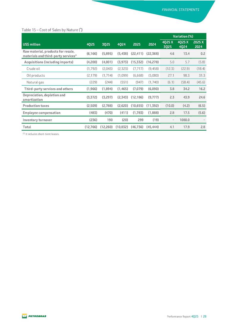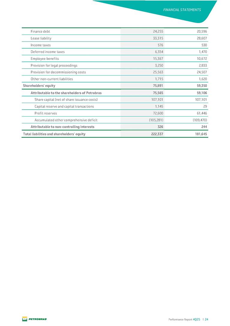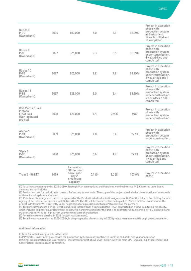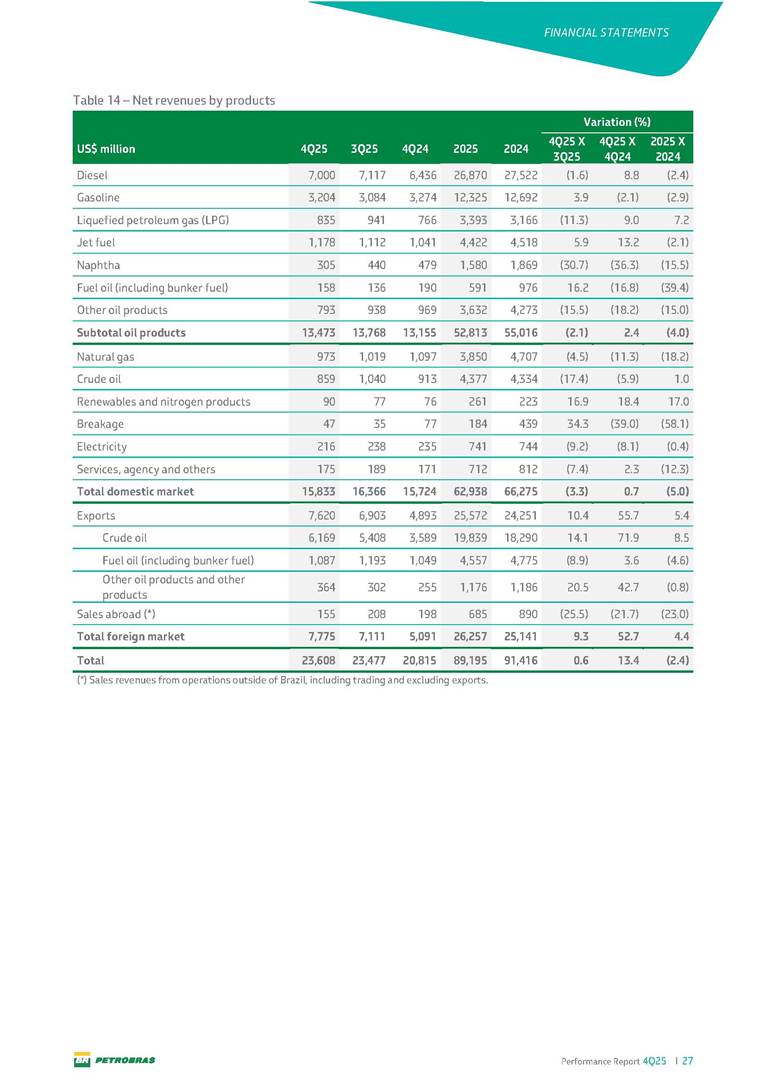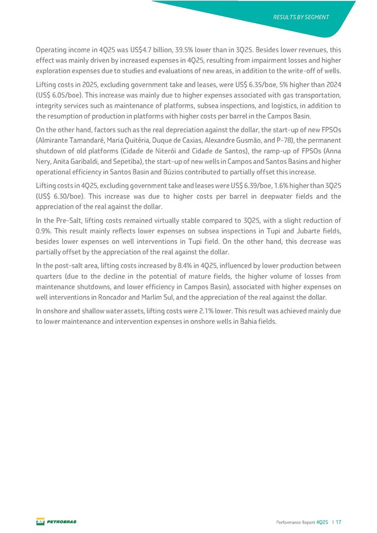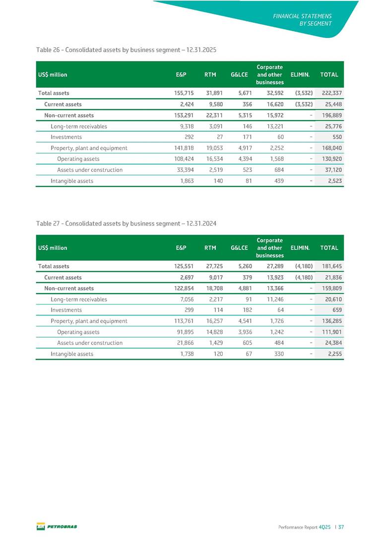 Performance Report4Q25 — P-78 First oil in December 2025, in the Búzios Field Performance Report 4Q25 I 2 DISCLAIMER Table of Contents Highlights – 2025 4 Main items 5 Consolidated results 6 One-off events 7 Capex 9 Liquidity and capital resources 13 Debt metrics 15 Results by business segment 16 Exploration and Production 16 Refining, Transportation and Marketing 18 Gas and Low Carbon Energies 20 Reconciliation of Adjusted EBITDA 21 Exhibits 22 Financial statements 22 Financial information by business segment 31 Glossary 40 Performance Report 4Q25 I 3 DISCLAIMER Disclaimer This report may contain forward-looking statements about future events. Such forecasts reflect only the expectations of the company's management about future economic conditions, as well as the company's industry, performance and financial results, among others. The terms "anticipates", "believes", "expects", "predicts", "intends", "plans", "projects", "aims", "should", as well as other similar terms, are intended to identify such forecasts, which, of course, involve risks and uncertainties foreseen or not foreseen by the company and, consequently, are not guarantees of the company's future results. Therefore, future results of the company's operations may differ from current expectations, and the reader should not rely solely on the information contained herein. The Company undertakes no obligation to update the presentations and forecasts in the light of new information or future developments. The figures reported for 1Q26 onwards are estimates or targets. Additionally, this presentation contains some financial indicators that are not recognized under BR GAAP or IFRS Accounting Standards. These indicators do not have standardized meanings and may not be comparable to indicators with a similar description used by other companies. We provide these indicators because we use them as measures of the company's performance; they should not be considered in isolation or as a substitute for other financial metrics that have been disclosed in accordance with BR GAAP or IFRS Accounting Standards. See definitions of Free Cash Flow, Adjusted EBITDA and Net Debt in the Glossary and respective reconciliations in the Liquidity and Capital Resources, Reconciliation of Adjusted EBITDA and Net Debt sections. Consolidated financial statements has been prepared in accordance with IFRS Accounting Standards and audited by independent auditors. Performance Report 4Q25 I 4 HIGHLIGHTS Highlights – 2025 “2025 results confirm the consistency of our strategy, based on capital discipline, production growth and operational efficiency. Even in a backdrop of a sharp decline in Brent prices, we generated US$ 36 billion in operating cash for the year. We continue to deliver a robust cash flow, supported by quality projects that increase production, with high returns and quick cash generation. This solid combination creates value and ensures lasting benefits for Brazilian society and our shareholders." Fernando Melgarejo, Chief Financial Officer and Investor Relations Officer Main financial highlights • Solid results in 2025: Adjusted EBITDA excluding one-off events of US$ 43.8 billion and Net Income excluding one-off events of US$ 18.1 billion • Maintenance of strong cash generation with Operating Cash Flow of US$ 36.0 billion and Free Cash Flow of US$ 16.5 billion Contribution to society • We paid R$ 277.6 billion in taxes to the federal government, states, and municipalities in 2025 • The Board of Directors approved the submission to the Annual General Meeting of the proposal for shareholder remuneration totaling R$ 8.1 billion, related to the results of 4Q25 • We distributed R$ 45.2 billion in dividends (including interest on equity), of which R$ 17.6 billion for the Control Group • We allocated around R$ 2 billion in socio-environmental investments, sponsorships, and donations Performance Report 4Q25 I 5 HIGHLIGHTS Main items Table 1 – Main items Variation (%) US$ million 4Q25 3Q25 4Q24 2025 2024 4Q25 X 3Q25 4Q25 X 4Q24 2025 X 2024 Sales revenues 23,608 23,477 20,815 89,195 91,416 0.6 13.4 (2.4) Gross profit 10,842 11,217 9,983 42,459 45,972 (3.3) 8.6 (7.6) Operating expenses (5,330) (3,241) (7,196) (16,346) (19,096) 64.5 (25.9) (14.4) Consolidated net income (loss) attributable to the shareholders of Petrobras 2,899 6,027 (2,780) 19,634 7,528 (51.9) − 160.8 Consolidated net income (loss) excluding one-off events attributable to the shareholders of Petrobras (*) 4,750 5,235 3,083 18,115 19,370 (9.3) 54.1 (6.5) Net cash provided by operating activities 10,162 9,856 8,204 36,047 37,984 3.1 23.9 (5.1) Free cash flow 3,580 4,967 3,766 16,528 23,318 (27.9) (4.9) (29.1) Adjusted EBITDA 11,107 11,728 7,165 42,523 40,399 (5.3) 55.0 5.3 Adjusted EBITDA excluding one-off events (*) 10,935 11,954 9,879 43,771 45,886 (8.5) 10.7 (4.6) Gross debt (US$ million) 69,793 70,711 60,311 69,793 60,311 (1.3) 15.7 15.7 Net debt (US$ million) 60,593 59,053 52,240 60,593 52,240 2.6 16.0 16.0 Net debt/LTM Adjusted EBITDA ratio 1.42 1.53 1.29 1.42 1.29 (7.2) 10.1 10.1 Average commercial selling rate for U.S. dollar 5.39 5.45 5.84 5.59 5.39 (1.1) (7.7) 3.7 Brent crude (US$/bbl) 63.69 69.07 74.69 69.06 80.76 (7.8) (14.7) (14.5) Price of basic oil products - Domestic Market (US$/bbl) 84.67 84.54 83.30 84.68 89.57 0.1 1.6 (5.5) ROCE (Return on Capital Employed) 6.6% 5.7% 7.2% 6.6% 7.2% 0,9 p.p. -0,6 p.p. -0,6 p.p. (*) See reconciliation of net income and adjusted EBITDA excluding one-off events. Performance Report 4Q25 I 6 CONSOLIDATE RESULTS Consolidated results In 2025, we delivered solid financial results, even in the face of a challenging backdrop, marked by a 14% drop in Brent prices compared to the previous year. This performance was mainly driven by excellent operational results, especially the 11% increase in total oil and gas production. As a result, we achieved an adjusted EBITDA of US$ 43.8 billion and Net Income of US$ 18.1 billion, both ex