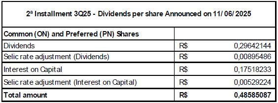This second installment will be paid both as dividends and as interest on capital, whose gross amounts per share will be adjusted by the Selic rate from 12/31/2025 to 03/20/2026, according to the interest rate adjustment calculation, as demonstrated below: