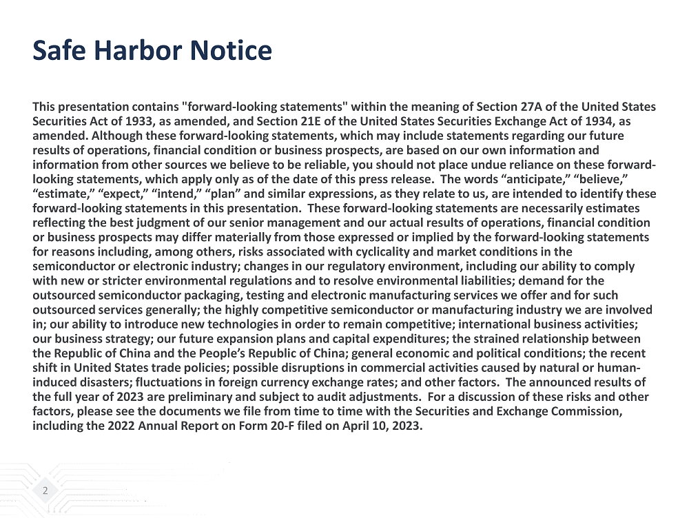 Safe Harbor Notice This presentation contains "forward - looking statements" within the meaning of Section 27A of the United States Securities Act of 1933, as amended, and Section 21E of the United States Securities Exchange Act of 1934, as amended. Although these forward - looking statements, which may include statements regarding our future results of operations, financial condition or business prospects, are based on our own information and information from other sources we believe to be reliable, you should not place undue reliance on these forward - looking statements, which apply only as of the date of this press release. The words “anticipate,” “believe,” “estimate,” “expect,” “intend,” “plan” and similar expressions, as they relate to us, are intended to identify these forward - looking statements in this presentation. These forward - looking statements are necessarily estimates reflecting the best judgment of our senior management and our actual results of operations, financial condition or business prospects may differ materially from those expressed or implied by the forward - looking statements for reasons including, among others, risks associated with cyclicality and market conditions in the semiconductor or electronic industry; changes in our regulatory environment, including our ability to comply with new or stricter environmental regulations and to resolve environmental liabilities; demand for the outsourced semiconductor packaging, testing and electronic manufacturing services we offer and for such outsourced services generally; the highly competitive semiconductor or manufacturing industry we are involved in; our ability to introduce new technologies in order to remain competitive; international business activities; our business strategy; our future expansion plans and capital expenditures; the strained relationship between the Republic of China and the People’s Republic of China; general economic and political conditions; the recent shift in United States trade policies; possible disruptions in commercial activities caused by natural or human - induced disasters; fluctuations in foreign currency exchange rates; and other factors. The announced results of the full year of 2023 are preliminary and subject to audit adjustments . For a discussion of these risks and other factors, please see the documents we file from time to time with the Securities and Exchange Commission, including the 2022 Annual Report on Form 20 - F filed on April 10, 2023 . 2