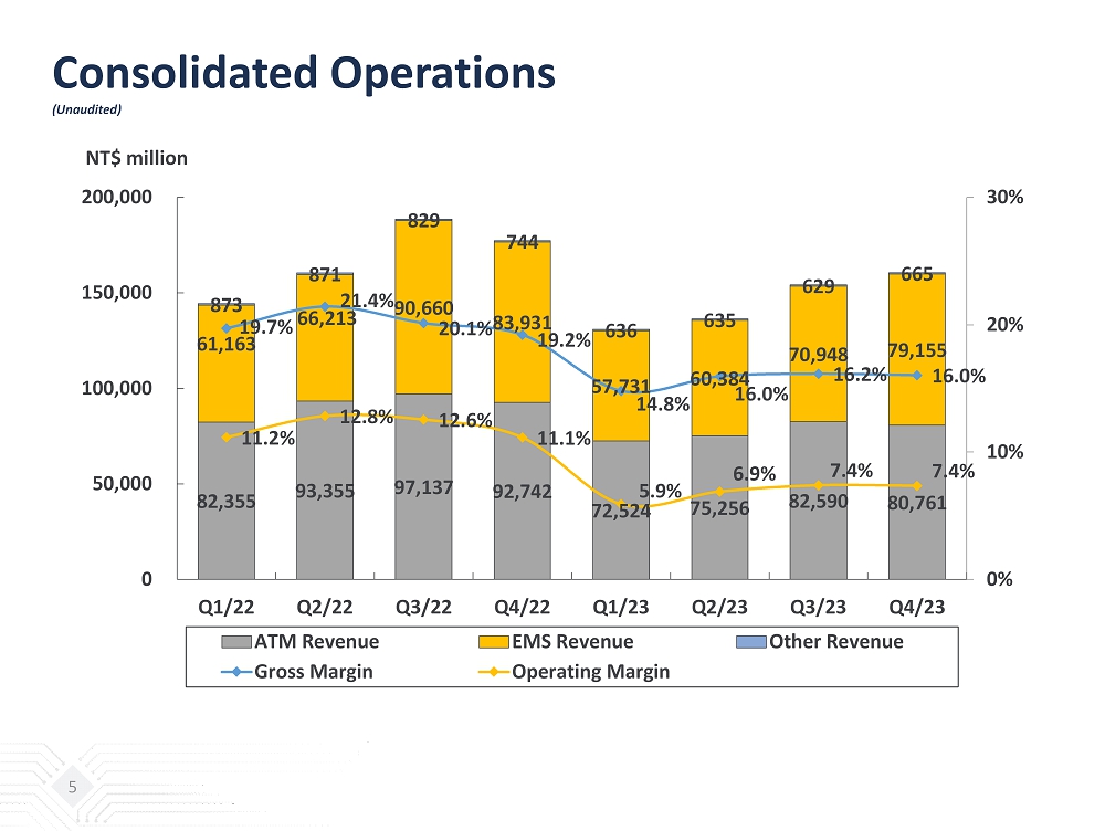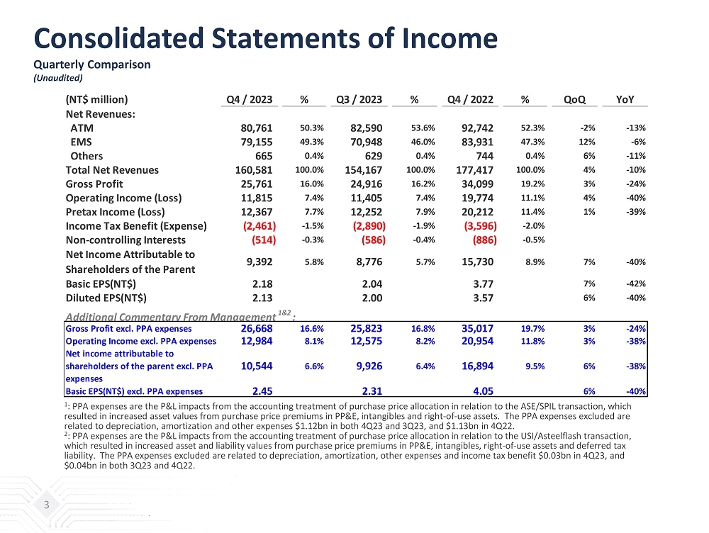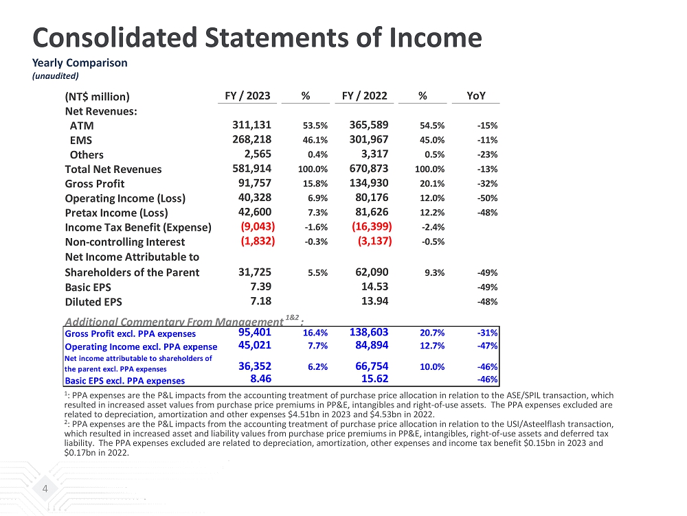 Consolidated Statements of Income Quarterly Comparison (Unaudited) 3 (NT$ million) Q4 / 2023 % Q3 / 2023 % Q4 / 2022 % QoQ YoY Net Revenues: ATM 80,761 50.3% 82,590 53.6% 92,742 52.3% -2% -13% EMS 79,155 49.3% 70,948 46.0% 83,931 47.3% 12% -6% Others 665 0.4% 629 0.4% 744 0.4% 6% -11% Total Net Revenues 160,581 100.0% 154,167 100.0% 177,417 100.0% 4% -10% Gross Profit 25,761 16.0% 24,916 16.2% 34,099 19.2% 3% -24% Operating Income (Loss) 11,815 7.4% 11,405 7.4% 19,774 11.1% 4% -40% Pretax Income (Loss) 12,367 7.7% 12,252 7.9% 20,212 11.4% 1% -39% Income Tax Benefit (Expense) (2,461) -1.5% (2,890) -1.9% (3,596) -2.0% Non-controlling Interests (514) -0.3% (586) -0.4% (886) -0.5% Net Income Attributable to Shareholders of the Parent 9,392 5.8% 8,776 5.7% 15,730 8.9% 7% -40% Basic EPS(NT$) 2.18 2.04 3.77 7% -42% Diluted EPS(NT$) 2.13 2.00 3.57 6% -40% Additional Commentary From Management 1&2 : Gross Profit excl. PPA expenses 26,668 16.6% 25,823 16.8% 35,017 19.7% 3% -24% Operating Income excl. PPA expenses 12,984 8.1% 12,575 8.2% 20,954 11.8% 3% -38% Net income attributable to shareholders of the parent excl. PPA expenses 10,544 6.6% 9,926 6.4% 16,894 9.5% 6% -38% Basic EPS(NT$) excl. PPA expenses 2.45 2.31 4.05 6% -40% 1 : PPA expenses are the P&L impacts from the accounting treatment of purchase price allocation in relation to the ASE/SPIL trans act ion, which resulted in increased asset values from purchase price premiums in PP&E, intangibles and right - of - use assets. The PPA expenses excluded are related to depreciation, amortization and other expenses $1.12bn in both 4Q23 and 3Q23, and $1.13bn in 4Q22. 2 : PPA expenses are the P&L impacts from the accounting treatment of purchase price allocation in relation to the USI/ Asteelflash transaction, which resulted in increased asset and liability values from purchase price premiums in PP&E, intangibles, right - of - use assets an d deferred tax liability. The PPA expenses excluded are related to depreciation, amortization, other expenses and income tax benefit $0.03bn in 4Q23, and $0.04bn in both 3Q23 and 4Q22.