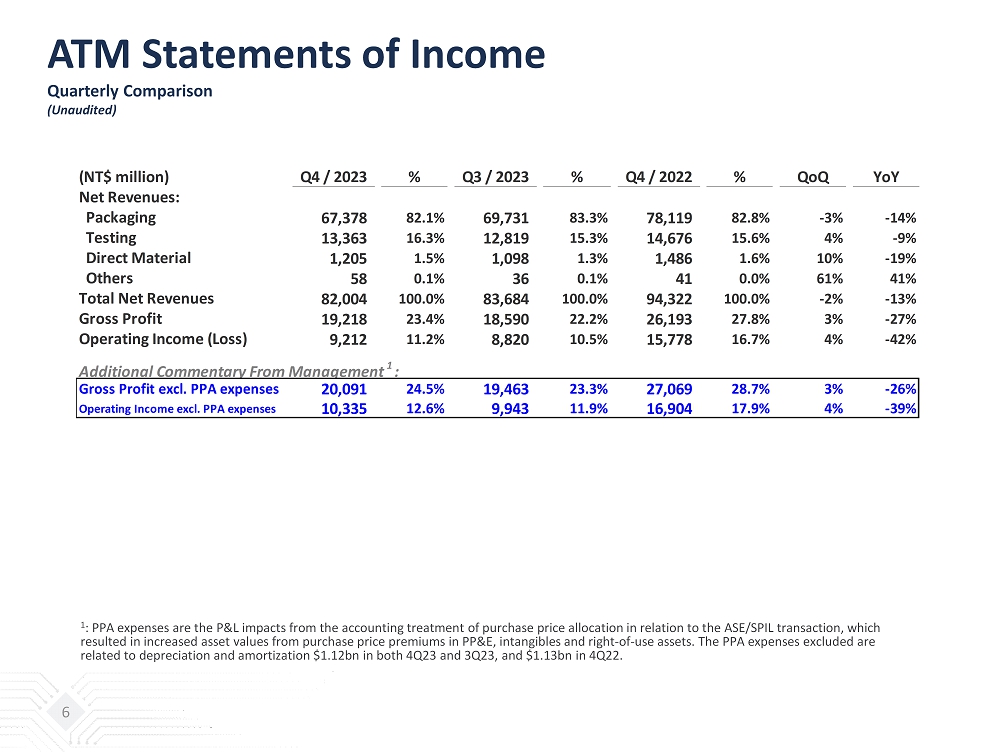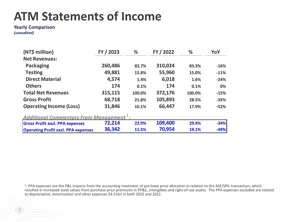 ATM Statements of Income Quarterly Comparison (Unaudited) 6 (NT$ million) Q4 / 2023 % Q3 / 2023 % Q4 / 2022 % QoQ YoY Net Revenues: Packaging 67,378 82.1% 69,731 83.3% 78,119 82.8% -3% -14% Testing 13,363 16.3% 12,819 15.3% 14,676 15.6% 4% -9% Direct Material 1,205 1.5% 1,098 1.3% 1,486 1.6% 10% -19% Others 58 0.1% 36 0.1% 41 0.0% 61% 41% Total Net Revenues 82,004 100.0% 83,684 100.0% 94,322 100.0% -2% -13% Gross Profit 19,218 23.4% 18,590 22.2% 26,193 27.8% 3% -27% Operating Income (Loss) 9,212 11.2% 8,820 10.5% 15,778 16.7% 4% -42% Additional Commentary From Management 1 : Gross Profit excl. PPA expenses 20,091 24.5% 19,463 23.3% 27,069 28.7% 3% -26% Operating Income excl. PPA expenses 10,335 12.6% 9,943 11.9% 16,904 17.9% 4% -39% 1 : PPA expenses are the P&L impacts from the accounting treatment of purchase price allocation in relation to the ASE/SPIL transacti on, which resulted in increased asset values from purchase price premiums in PP&E, intangibles and right - of - use assets. The PPA expenses e xcluded are related to depreciation and amortization $1.12bn in both 4Q23 and 3Q23, and $1.13bn in 4Q22.