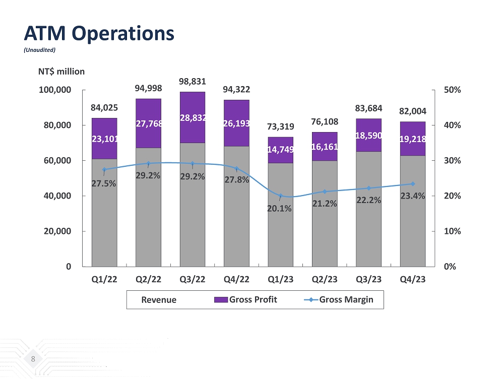 ATM Statements of Income Yearly Comparison (unaudited) (NT$ million) FY / 2023 % FY / 2022 % YoYNet Revenues: Packaging 260,486 82.7% 310,024 83.3% -16% Testing 49,881 15.8% 55,960 15.0% -11% Direct Material 4,574 1.4% 6,018 1.6% -24% Others 174 0.1% 174 0.1% 0% Total Net Revenues 315,115 100.0% 372,176 100.0% -15% Gross Profit 68,718 21.8% 105,893 28.5% -35% Operating Income (Loss) 31,846 10.1% 66,447 17.9% -52% Additional Commentary From Management 1 : Gross Profit excl. PPA expenses 72,214 22.9% 109,400 29.4% -34% Operating Profit excl. PPA expenses 36,342 11.5% 70,954 19.1% -49% 1 : PPA expenses are the P&L impacts from the accounting treatment of purchase price allocation in relation to the ASE/SPIL tra nsa ction, which resulted in increased asset values from purchase price premiums in PP&E, intangibles and right - of - use assets. The PPA expenses excluded are related to depreciation, amortization and other expenses $4.51bn in both 2023 and 2022. 7