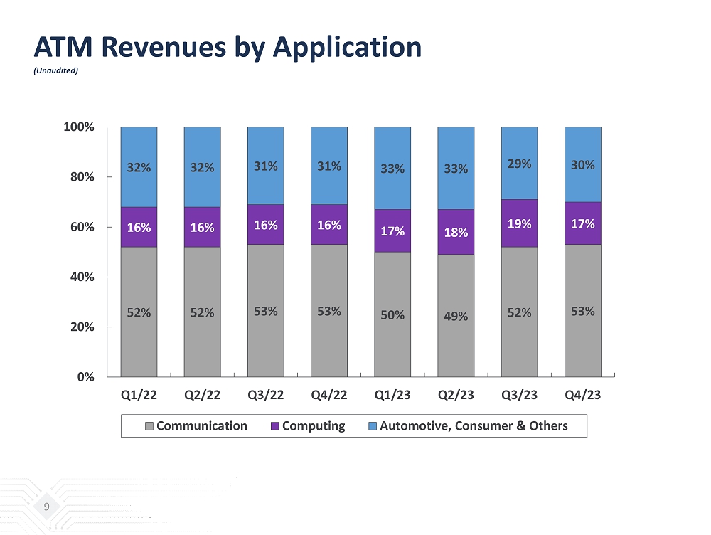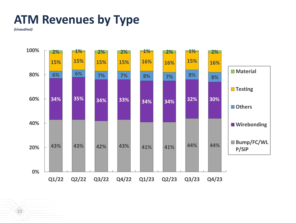 ATM Revenues by Application (Unaudited) 9 52% 52% 53% 53% 50% 49% 52% 53% 16% 16% 16% 16% 17% 18% 19% 17% 32% 32% 31% 31% 33% 33% 29% 30% 0% 20% 40% 60% 80% 100% Q1/22 Q2/22 Q3/22 Q4/22 Q1/23 Q2/23 Q3/23 Q4/23 Communication Computing Automotive, Consumer & Others