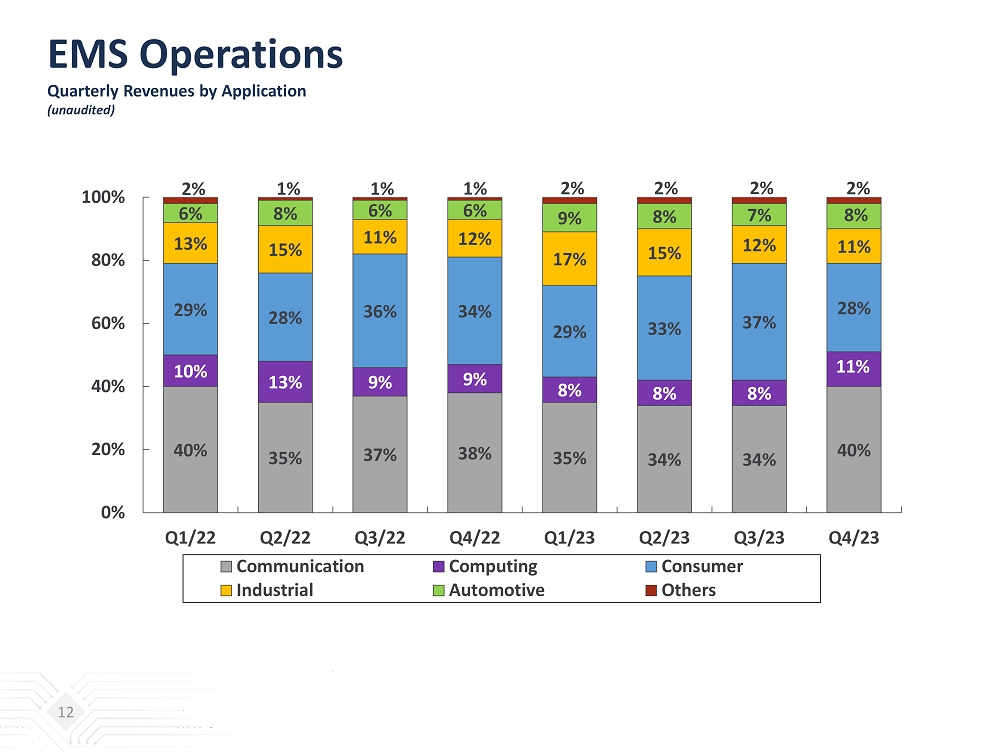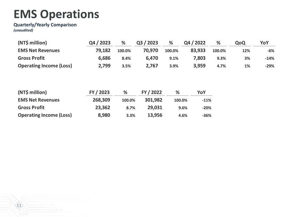 EMS Operations Quarterly/Yearly Comparison (unaudited) (NT$ million) Q4 / 2023 % Q3 / 2023 % Q4 / 2022 % QoQ YoY EMS Net Revenues 79,182 100.0% 70,970 100.0% 83,933 100.0% 12% -6% Gross Profit 6,686 8.4% 6,470 9.1% 7,803 9.3% 3% -14% Operating Income (Loss) 2,799 3.5% 2,767 3.9% 3,959 4.7% 1% -29% (NT$ million) FY / 2023 % FY / 2022 % YoY EMS Net Revenues 268,309 100.0% 301,982 100.0% -11% Gross Profit 23,362 8.7% 29,031 9.6% -20% Operating Income (Loss) 8,980 3.3% 13,956 4.6% -36% 11