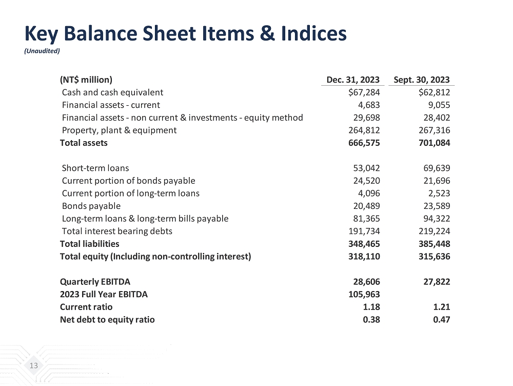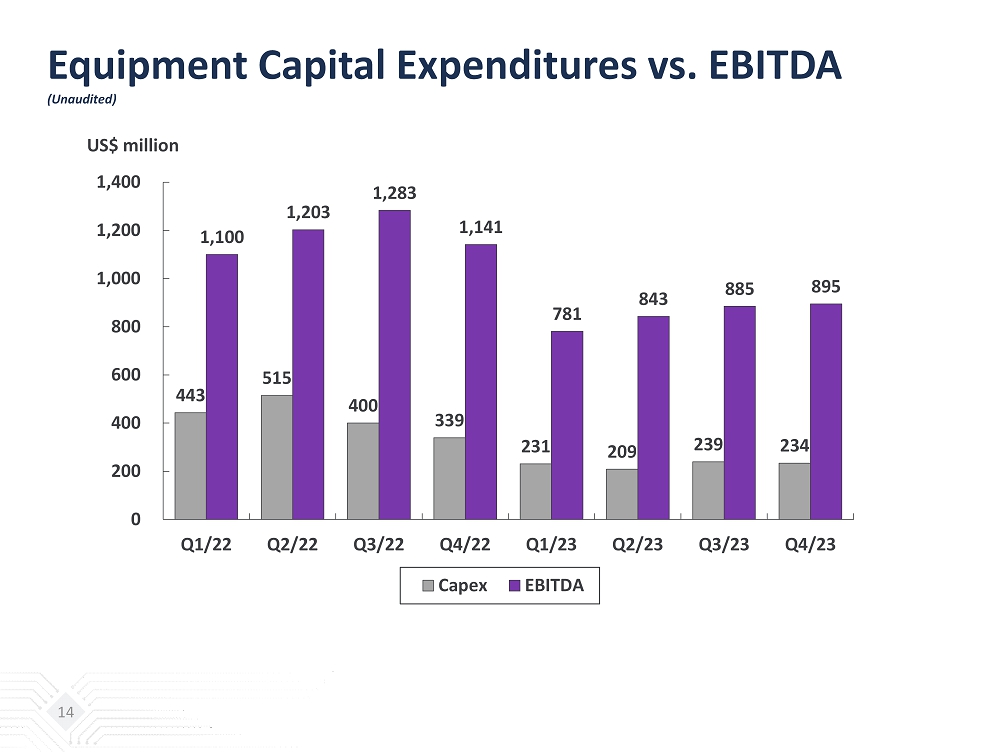 Key Balance Sheet Items & Indices (Unaudited) 13 (NT$ million) Dec. 31, 2023 Sept. 30, 2023 Cash and cash equivalent $67,284 $62,812 Financial assets - current 4,683 9,055 Financial assets - non current & investments - equity method 29,698 28,402 Property, plant & equipment 264,812 267,316 Total assets 666,575 701,084 Short-term loans 53,042 69,639 Current portion of bonds payable 24,520 21,696 Current portion of long-term loans 4,096 2,523 Bonds payable 20,489 23,589 Long-term loans & long-term bills payable 81,365 94,322 Total interest bearing debts 191,734 219,224 Total liabilities 348,465 385,448 Total equity (Including non-controlling interest) 318,110 315,636 Quarterly EBITDA 28,606 27,822 2023 Full Year EBITDA 105,963 Current ratio 1.18 1.21 Net debt to equity ratio 0.38 0.47