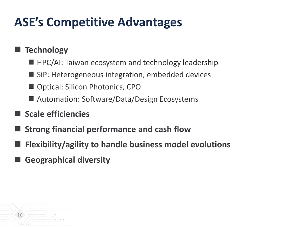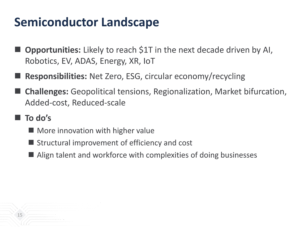 Semiconductor Landscape  Opportunities: Likely to reach $1T in the next decade driven by AI, Robotics, EV, ADAS, Energy, XR, IoT  Responsibilities: Net Zero, ESG, circular economy/recycling  Challenges : Geopolitical tensions, Regionalization, Market bifurcation, Added - cost , Reduced - scale  To do’s  More innovation with higher value  Structural improvement of efficiency and cost  Align talent and workforce with complexities of doing businesses 15