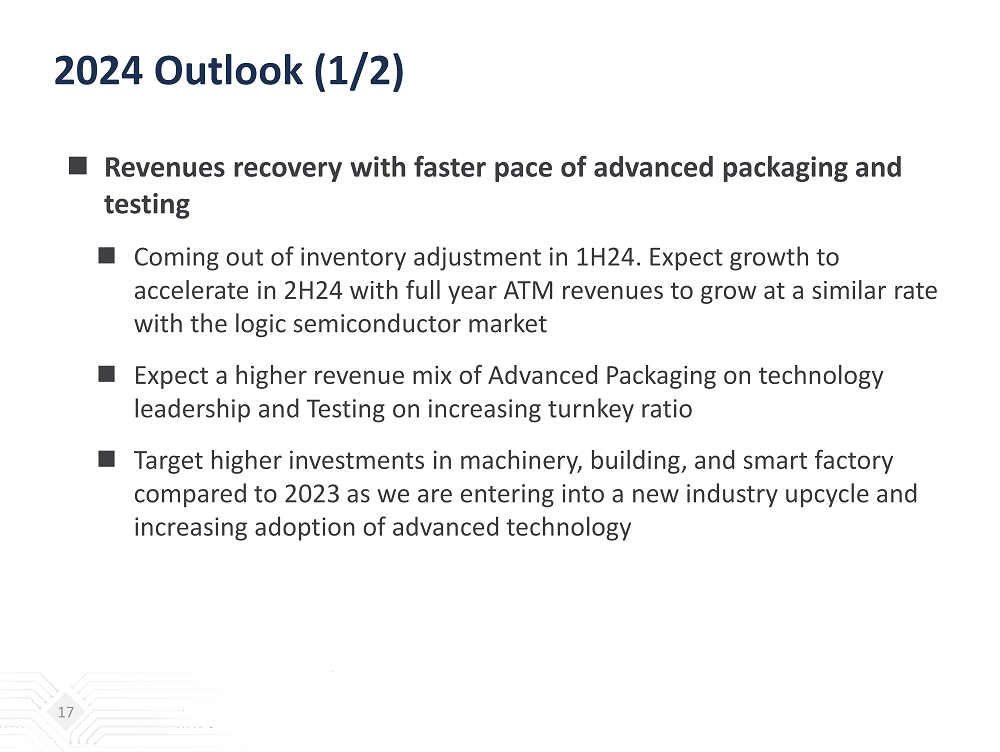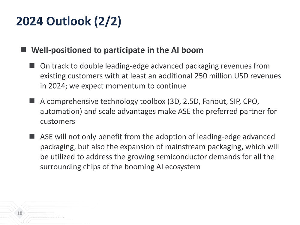 2024 Outlook (1/2)  Revenues recovery with faster pace of advanced packaging and testing  Coming out of inventory adjustment in 1H24. Expect growth to accelerate in 2H24 with full year ATM revenues to grow at a similar rate with the logic semiconductor market  Expect a higher revenue mix of Advanced Packaging on technology leadership and Testing on increasing turnkey ratio  Target higher investments in machinery, building, and smart factory compared to 2023 as we are entering into a new industry upcycle and increasing adoption of advanced technology 17