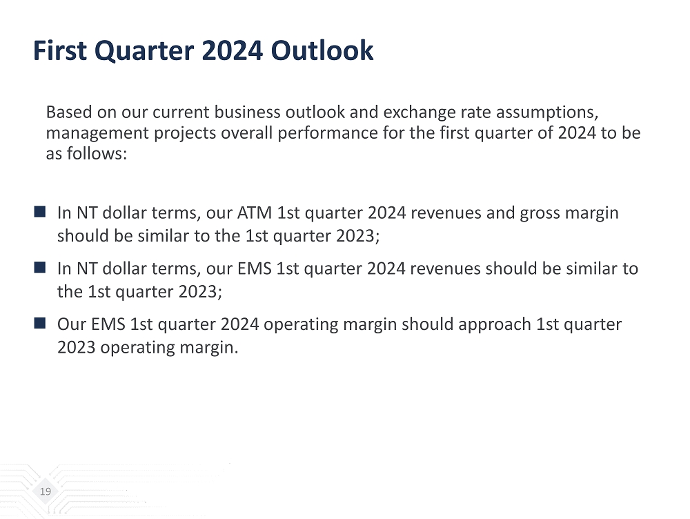First Quarter 2024 Outlook Based on our current business outlook and exchange rate assumptions, management projects overall performance for the first quarter of 2024 to be as follows:  In NT dollar terms, our ATM 1st quarter 2024 revenues and gross margin should be similar to the 1st quarter 2023 ;  In NT dollar terms, our EMS 1st quarter 2024 revenues should be similar to the 1st quarter 2023;  Our EMS 1st quarter 2024 operating margin should approach 1st quarter 2023 operating margin. 19