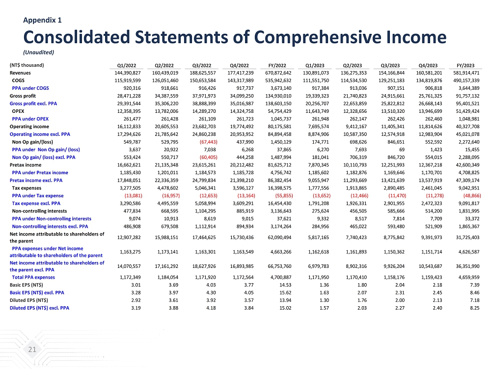 Appendix 1 Consolidated Statements of Comprehensive Income (Unaudited) 21 (NT$ thousand) Q1/2022 Q2/2022 Q3/2022 Q4/2022 FY/2022 Q1/2023 Q2/2023 Q3/2023 Q4/2023 FY/2023 Revenues 144,390,827 160,439,019 188,625,557 177,417,239 670,872,642 130,891,073 136,275,353 154,166,844 160,581,201 581,914,471 COGS 115,919,599 126,051,460 150,653,584 143,317,989 535,942,632 111,551,750 114,534,530 129,251,183 134,819,876 490,157,339 PPA under COGS 920,316 918,661 916,426 917,737 3,673,140 917,384 913,036 907,151 906,818 3,644,389 Gross profit 28,471,228 34,387,559 37,971,973 34,099,250 134,930,010 19,339,323 21,740,823 24,915,661 25,761,325 91,757,132 Gross profit excl. PPA 29,391,544 35,306,220 38,888,399 35,016,987 138,603,150 20,256,707 22,653,859 25,822,812 26,668,143 95,401,521 OPEX 12,358,395 13,782,006 14,289,270 14,324,758 54,754,429 11,643,749 12,328,656 13,510,320 13,946,699 51,429,424 PPA under OPEX 261,477 261,428 261,109 261,723 1,045,737 261,948 262,147 262,426 262,460 1,048,981 Operating income 16,112,833 20,605,553 23,682,703 19,774,492 80,175,581 7,695,574 9,412,167 11,405,341 11,814,626 40,327,708 Operating income excl. PPA 17,294,626 21,785,642 24,860,238 20,953,952 84,894,458 8,874,906 10,587,350 12,574,918 12,983,904 45,021,078 Non Op gain/(loss) 549,787 529,795 (67,443) 437,990 1,450,129 174,771 698,626 846,651 552,592 2,272,640 PPA under Non Op gain/ (loss) 3,637 20,922 7,038 6,268 37,865 6,270 7,693 69 1,423 15,455 Non Op gain/ (loss) excl. PPA 553,424 550,717 (60,405) 444,258 1,487,994 181,041 706,319 846,720 554,015 2,288,095 Pretax income 16,662,621 21,135,348 23,615,261 20,212,482 81,625,712 7,870,345 10,110,793 12,251,993 12,367,218 42,600,349 PPA under Pretax income 1,185,430 1,201,011 1,184,573 1,185,728 4,756,742 1,185,602 1,182,876 1,169,646 1,170,701 4,708,825 Pretax income excl. PPA 17,848,051 22,336,359 24,799,834 21,398,210 86,382,454 9,055,947 11,293,669 13,421,639 13,537,919 47,309,174 Tax expenses 3,277,505 4,478,602 5,046,341 3,596,127 16,398,575 1,777,556 1,913,865 2,890,485 2,461,045 9,042,951 PPA under Tax expense (13,081) (16,957) (12,653) (13,164) (55,855) (13,652) (12,466) (11,470) (11,278) (48,866) Tax expense excl. PPA 3,290,586 4,495,559 5,058,994 3,609,291 16,454,430 1,791,208 1,926,331 2,901,955 2,472,323 9,091,817 Non-controlling interests 477,834 668,595 1,104,295 885,919 3,136,643 275,624 456,505 585,666 514,200 1,831,995 PPA under Non-controlling interests 9,074 10,913 8,619 9,015 37,621 9,332 8,517 7,814 7,709 33,372 Non-controlling interests excl. PPA 486,908 679,508 1,112,914 894,934 3,174,264 284,956 465,022 593,480 521,909 1,865,367 Net income attributable to shareholders of the parent 12,907,282 15,988,151 17,464,625 15,730,436 62,090,494 5,817,165 7,740,423 8,775,842 9,391,973 31,725,403 PPA expenses under Net income attributable to shareholders of the parent 1,163,275 1,173,141 1,163,301 1,163,549 4,663,266 1,162,618 1,161,893 1,150,362 1,151,714 4,626,587 Net income attributable to shareholders of the parent excl. PPA 14,070,557 17,161,292 18,627,926 16,893,985 66,753,760 6,979,783 8,902,316 9,926,204 10,543,687 36,351,990 Total PPA expenses 1,172,349 1,184,054 1,171,920 1,172,564 4,700,887 1,171,950 1,170,410 1,158,176 1,159,423 4,659,959 Basic EPS (NT$) 3.01 3.69 4.03 3.77 14.53 1.36 1.80 2.04 2.18 7.39 Basic EPS (NT$) excl. PPA 3.28 3.97 4.30 4.05 15.62 1.63 2.07 2.31 2.45 8.46 Diluted EPS (NT$) 2.92 3.61 3.92 3.57 13.94 1.30 1.76 2.00 2.13 7.18 Diluted EPS (NT$) excl. PPA 3.19 3.88 4.18 3.84 15.02 1.57 2.03 2.27 2.40 8.25