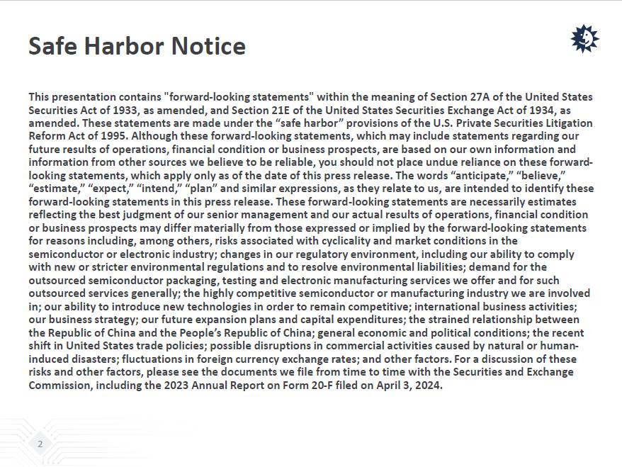 Safe Harbor Notice This presentation contains "forward - looking statements" within the meaning of Section 27A of the United States Securities Act of 1933, as amended, and Section 21E of the United States Securities Exchange Act of 1934, as amended. These statements are made under the “safe harbor” provisions of the U.S. Private Securities Litigation Reform Act of 1995. Although these forward - looking statements, which may include statements regarding our future results of operations, financial condition or business prospects, are based on our own information and information from other sources we believe to be reliable, you should not place undue reliance on these forward - looking statements, which apply only as of the date of this press release. The words “anticipate,” “believe,” “estimate,” “expect,” “intend,” “plan” and similar expressions, as they relate to us, are intended to identify these forward - looking statements in this press release. These forward - looking statements are necessarily estimates reflecting the best judgment of our senior management and our actual results of operations, financial condition or business prospects may differ materially from those expressed or implied by the forward - looking statements for reasons including, among others, risks associated with cyclicality and market conditions in the semiconductor or electronic industry; changes in our regulatory environment, including our ability to comply with new or stricter environmental regulations and to resolve environmental liabilities; demand for the outsourced semiconductor packaging, testing and electronic manufacturing services we offer and for such outsourced services generally; the highly competitive semiconductor or manufacturing industry we are involved in; our ability to introduce new technologies in order to remain competitive; international business activities; our business strategy; our future expansion plans and capital expenditures; the strained relationship between the Republic of China and the People’s Republic of China; general economic and political conditions; the recent shift in United States trade policies; possible disruptions in commercial activities caused by natural or human - induced disasters; fluctuations in foreign currency exchange rates; and other factors. For a discussion of these risks and other factors, please see the documents we file from time to time with the Securities and Exchange Commission, including the 2023 Annual Report on Form 20 - F filed on April 3, 2024 . 2