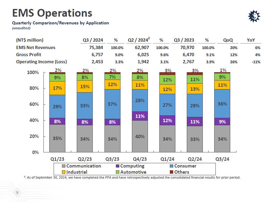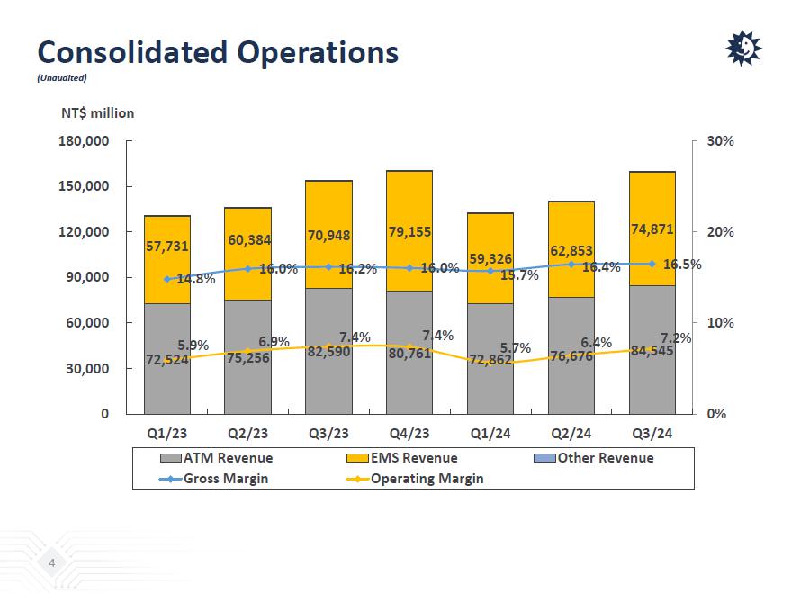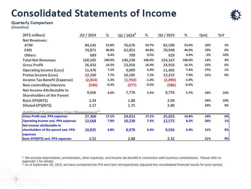 Consolidated Statements of Income Quarterly Comparison (Unaudited) 3 (NT$ million) Q2 / 2024 % Q1 / 2024 % Q2 / 2023 % QoQ YoY Net Revenues: ATM 76,676 54.7% 72,862 54.9% 75,256 55.2% 5% 2% EMS 62,853 44.8% 59,326 44.7% 60,384 44.3% 6% 4% Others 709 0.5% 615 0.4% 635 0.5% 15% 12% Total Net Revenues 140,238 100.0% 132,803 100.0% 136,275 100.0% 6% 3% Gross Profit 23,066 16.4% 20,868 15.7% 21,741 16.0% 11% 6% Operating Income (Loss) 9,021 6.4% 7,525 5.7% 9,412 6.9% 20% -4% Pretax Income (Loss) 10,117 7.2% 7,860 5.9% 10,111 7.4% 29% 0% Income Tax Benefit (Expense) (1,952) -1.4% (1,904) -1.4% (1,914) -1.4% Non-controlling Interests (382) -0.3% (274) -0.2% (457) -0.3% Net Income Attributable to Shareholders of the Parent 7,783 5.5% 5,682 4.3% 7,740 5.7% 37% 1% Basic EPS(NT$) 1.80 1.32 1.80 36% 0% Diluted EPS(NT$) 1.75 1.28 1.76 37% -1% Additional Commentary From Management 1&2 : Gross Profit excl. PPA expenses 24,013 17.1% 21,775 16.4% 22,654 16.6% 10% 6% Operating Income excl. PPA expenses 10,230 7.3% 8,695 6.5% 10,587 7.8% 18% -3% Net income attributable to shareholders of the parent excl. PPA expenses 8,978 6.4% 6,834 5.1% 8,902 6.5% 31% 1% Basic EPS(NT$) excl. PPA expenses 2.08 1.58 2.07 32% 0% 1 : PPA expenses are the P&L impacts from the accounting treatment of purchase price allocation in relation to the ASE/SPIL trans act ion, which resulted in increased asset values from purchase price premiums in PP&E, intangibles and right - of - use assets. The PPA expenses excluded are related to depreciation, amortization and other expenses NT$1.17bn in 2Q24, and NT$1.13bn in both 1Q24 and 2Q23. 2 : PPA expenses are the P&L impacts from the accounting treatment of purchase price allocation in relation to the USI/ Asteelflash transaction, which resulted in increased asset and liability values from purchase price premiums in PP&E, intangibles, right - of - use assets an d deferred tax liability. The PPA expenses excluded are related to depreciation, amortization, other expenses and income tax benefit NT$0.04bn in both 2Q24 and 2Q23, and NT$0.03bn in 1Q24.