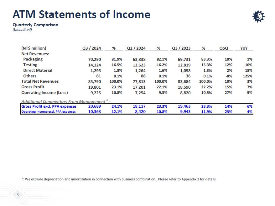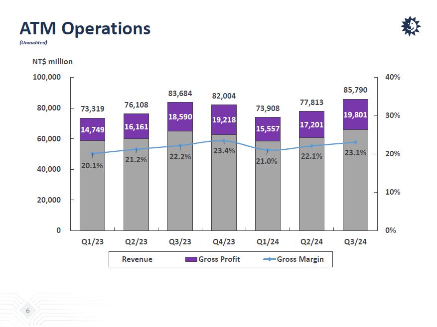 ATM Statements of Income Quarterly Comparison (Unaudited) 5 (NT$ million) Q2 / 2024 % Q1 / 2024 % Q2 / 2023 % QoQ YoY Net Revenues: Packaging 63,838 82.1% 60,388 81.7% 62,607 82.3% 6% 2% Testing 12,623 16.2% 12,102 16.4% 12,292 16.1% 4% 3% Direct Material 1,264 1.6% 1,338 1.8% 1,165 1.5% -6% 8% Others 88 0.1% 80 0.1% 44 0.1% 10% 100% Total Net Revenues 77,813 100.0% 73,908 100.0% 76,108 100.0% 5% 2% Gross Profit 17,201 22.1% 15,557 21.0% 16,161 21.2% 11% 6% Operating Income (Loss) 7,254 9.3% 6,077 8.2% 7,405 9.7% 19% -2% Additional Commentary From Management 1 : Gross Profit excl. PPA expenses 18,117 23.3% 16,433 22.2% 17,035 22.4% 10% 6% Operating Income excl. PPA expenses 8,420 10.8% 7,203 9.7% 8,529 11.2% 17% -1% 1 : PPA expenses are the P&L impacts from the accounting treatment of purchase price allocation in relation to the ASE/SPIL transacti on, which resulted in increased asset values from purchase price premiums in PP&E, intangibles and right - of - use assets. The PPA expenses e xcluded are related to depreciation, amortization and other expenses NT1.17bn in 2Q24, NT$1.13bn in 1Q24, and NT$1.12bn in 2Q23.