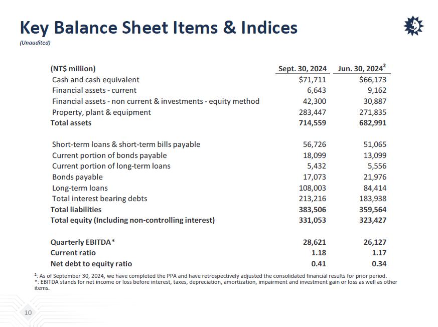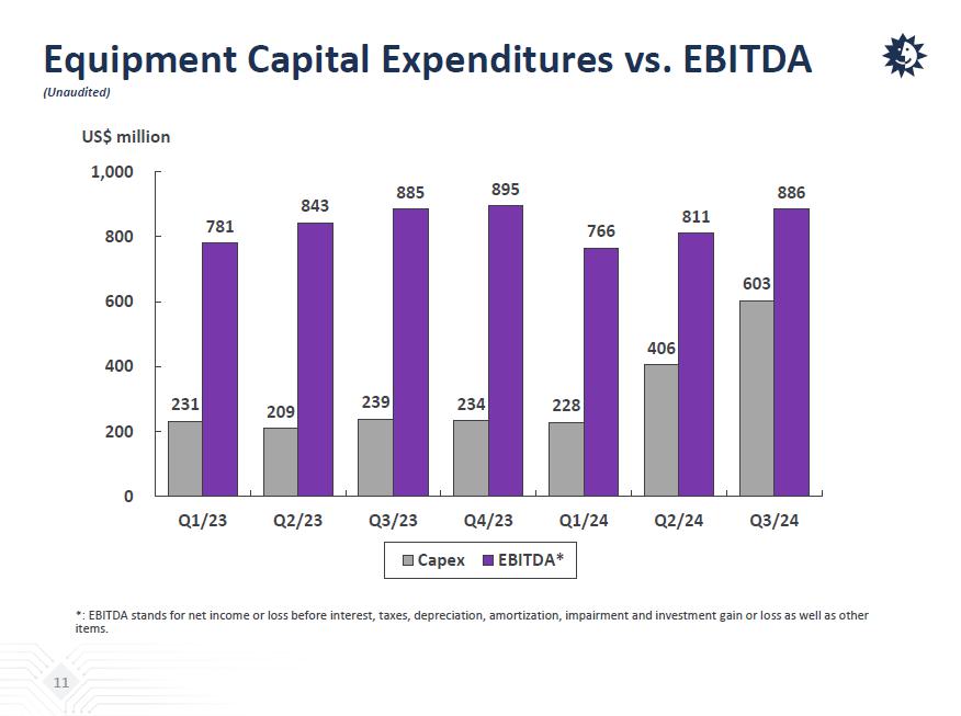 Key Balance Sheet Items & Indices (Unaudited) 10 (NT$ million) Jun. 30, 2024 Mar. 31, 2024 Cash and cash equivalent $66,173 $75,105 Financial assets - current 9,162 8,410 Financial assets - non current & investments - equity method 30,887 30,776 Property, plant & equipment 271,835 265,592 Total assets 682,930 681,470 Short-term loans & short-term bills payable 51,065 56,863 Current portion of bonds payable 13,099 9,602 Current portion of long-term loans 5,556 4,473 Bonds payable 21,976 31,618 Long-term loans 84,414 84,589 Total interest bearing debts 183,938 195,344 Total liabilities 359,460 369,301 Total equity (Including non-controlling interest) 323,470 312,169 Quarterly EBITDA* 26,127 23,974 Current ratio 1.17 1.19 Net debt to equity ratio 0.34 0.36 * : EBITDA stands for net income or loss before interest, taxes, depreciation, amortization, impairment and investment gain or lo ss as well as other items.