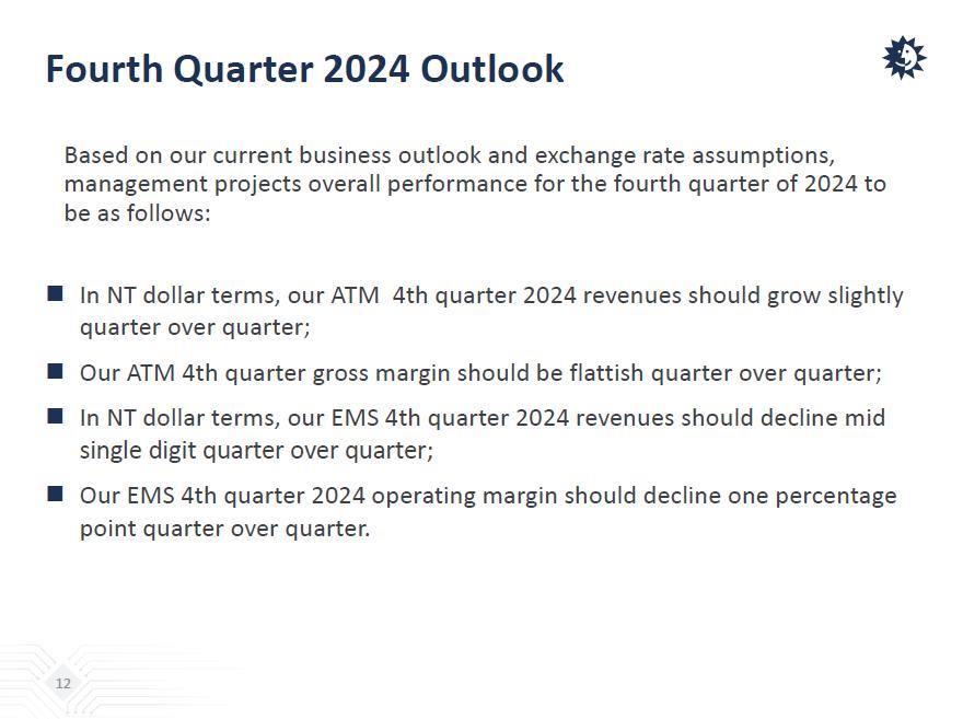 Third Quarter 2024 Outlook Based on our current business outlook and exchange rate assumptions, management projects overall performance for the third quarter of 2024 to be as follows:  In NT dollar terms, our ATM 3 rd quarter 2024 revenues should grow by high single digits quarter over quarter;  Our ATM 3 rd quarter gross margin should be between 23% to 23.5 %;  In NT dollar terms, our EMS 3 rd quarter 2024 revenues should grow mid to high teens quarter over quarter;  Our EMS 3 rd quarter 2024 operating margin should be slightly above 4 th quarter 2023 levels of 3.5 %. 12