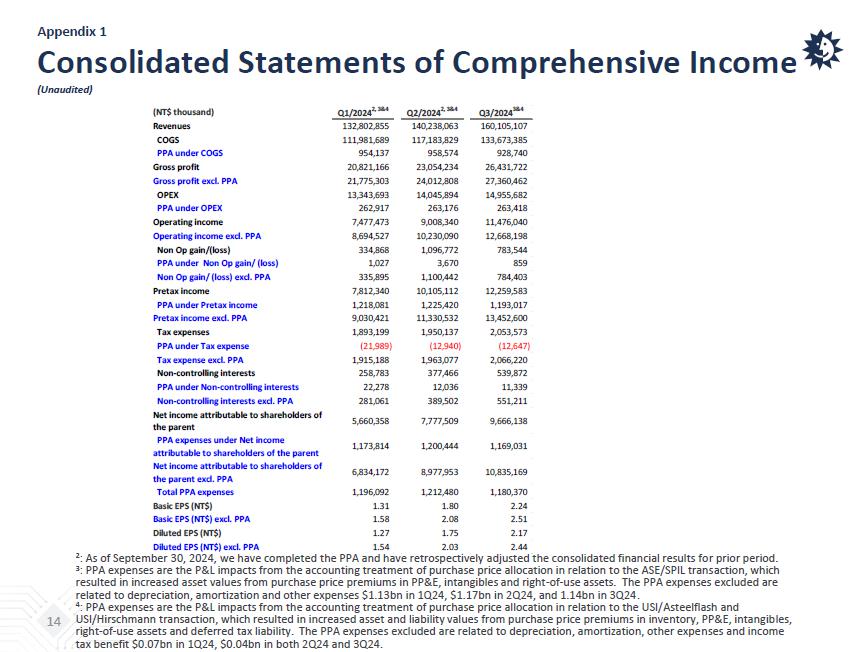 Appendix 1 Consolidated Statements of Comprehensive Income (Unaudited) 14 (NT$ thousand) Q1/2023 Q2/2023 Q3/2023 Q4/2023 FY/2023 Q1/2024 Q2/2024 Revenues 130,891,073 136,275,353 154,166,844 160,581,201 581,914,471 132,802,855 140,238,063 COGS 111,551,750 114,534,530 129,251,183 134,819,876 490,157,339 111,934,809 117,172,132 PPA under COGS 917,384 913,036 907,151 906,818 3,644,389 907,257 946,878 Gross profit 19,339,323 21,740,823 24,915,661 25,761,325 91,757,132 20,868,046 23,065,931 Gross profit excl. PPA 20,256,707 22,653,859 25,822,812 26,668,143 95,401,521 21,775,303 24,012,809 OPEX 11,643,749 12,328,656 13,510,320 13,946,699 51,429,424 13,343,096 14,045,278 PPA under OPEX 261,948 262,147 262,426 262,460 1,048,981 262,320 262,560 Operating income 7,695,574 9,412,167 11,405,341 11,814,626 40,327,708 7,524,950 9,020,653 Operating income excl. PPA 8,874,906 10,587,350 12,574,918 12,983,904 45,021,078 8,694,527 10,230,091 Non Op gain/(loss) 174,771 698,626 846,651 552,592 2,272,640 334,868 1,096,772 PPA under Non Op gain/ (loss) 6,270 7,693 69 1,423 15,455 1,027 3,670 Non Op gain/ (loss) excl. PPA 181,041 706,319 846,720 554,015 2,288,095 335,895 1,100,442 Pretax income 7,870,345 10,110,793 12,251,993 12,367,218 42,600,349 7,859,818 10,117,424 PPA under Pretax income 1,185,602 1,182,876 1,169,646 1,170,701 4,708,825 1,170,604 1,213,108 Pretax income excl. PPA 9,055,947 11,293,669 13,421,639 13,537,919 47,309,174 9,030,422 11,330,532 Tax expenses 1,777,556 1,913,865 2,890,485 2,461,045 9,042,951 1,904,488 1,952,288 PPA under Tax expense (13,652) (12,466) (11,470) (11,278) (48,866) (10,700) (10,789) Tax expense excl. PPA 1,791,208 1,926,331 2,901,955 2,472,323 9,091,817 1,915,188 1,963,077 Non-controlling interests 275,624 456,505 585,666 514,200 1,831,995 273,822 381,687 PPA under Non-controlling interests 9,332 8,517 7,814 7,709 33,372 7,239 7,815 Non-controlling interests excl. PPA 284,956 465,022 593,480 521,909 1,865,367 281,061 389,502 Net income attributable to shareholders of the parent 5,817,165 7,740,423 8,775,842 9,391,973 31,725,403 5,681,508 7,783,449 PPA expenses under Net income attributable to shareholders of the parent 1,162,618 1,161,893 1,150,362 1,151,714 4,626,587 1,152,665 1,194,504 Net income attributable to shareholders of the parent excl. PPA 6,979,783 8,902,316 9,926,204 10,543,687 36,351,990 6,834,173 8,977,953 Total PPA expenses 1,171,950 1,170,410 1,158,176 1,159,423 4,659,959 1,159,904 1,202,319 Basic EPS (NT$) 1.36 1.80 2.04 2.18 7.39 1.32 1.80 Basic EPS (NT$) excl. PPA 1.63 2.07 2.31 2.45 8.46 1.58 2.08 Diluted EPS (NT$) 1.30 1.76 2.00 2.13 7.18 1.28 1.75 Diluted EPS (NT$) excl. PPA 1.57 2.03 2.27 2.40 8.25 1.54 2.03