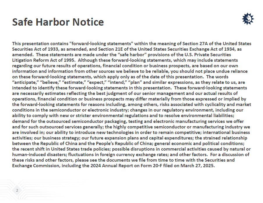 Safe Harbor Notice This presentation contains "forward - looking statements" within the meaning of Section 27A of the United States Securities Act of 1933, as amended, and Section 21E of the United States Securities Exchange Act of 1934, as amended . These statements are made under the “safe harbor” provisions of the U.S. Private Securities Litigation Reform Act of 1995. Although these forward - looking statements, which may include statements regarding our future results of operations, financial condition or business prospects, are based on our own information and information from other sources we believe to be reliable, you should not place undue reliance on these forward - looking statements, which apply only as of the date of this presentation. The words “anticipate,” “believe,” “estimate,” “expect,” “intend,” “plan” and similar expressions, as they relate to us, are intended to identify these forward - looking statements in this presentation. These forward - looking statements are necessarily estimates reflecting the best judgment of our senior management and our actual results of operations, financial condition or business prospects may differ materially from those expressed or implied by the forward - looking statements for reasons including, among others, risks associated with cyclicality and market conditions in the semiconductor or electronic industry; changes in our regulatory environment, including our ability to comply with new or stricter environmental regulations and to resolve environmental liabilities; demand for the outsourced semiconductor packaging, testing and electronic manufacturing services we offer and for such outsourced services generally; the highly competitive semiconductor or manufacturing industry we are involved in; our ability to introduce new technologies in order to remain competitive; international business activities; our business strategy; our future expansion plans and capital expenditures; the strained relationship between the Republic of China and the People’s Republic of China; general economic and political conditions; the recent shift in United States trade policies; possible disruptions in commercial activities caused by natural or human - induced disasters; fluctuations in foreign currency exchange rates; and other factors. For a discussion of these risks and other factors, please see the documents we file from time to time with the Securities and Exchange Commission, including the 2024 Annual Report on Form 20 - F filed on March 27, 2025. 2