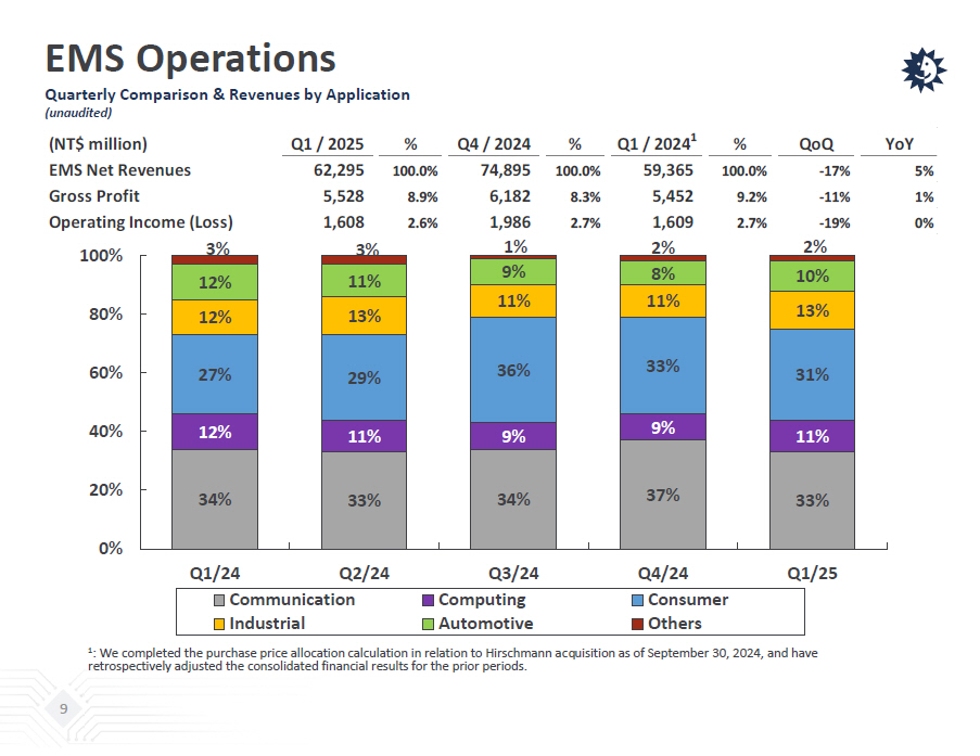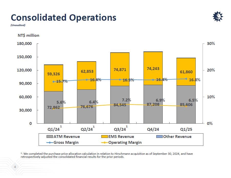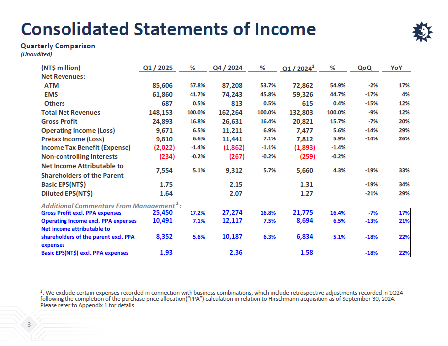 Consolidated Statements of Income Quarterly Comparison (Unaudited) 3 (NT$ million) Q1 / 2025 % Q4 / 2024 % Q1 / 2024 1 % QoQ YoY Net Revenues: ATM 85,606 57.8% 87,208 53.7% 72,862 54.9% -2% 17% EMS 61,860 41.7% 74,243 45.8% 59,326 44.7% -17% 4% Others 687 0.5% 813 0.5% 615 0.4% -15% 12% Total Net Revenues 148,153 100.0% 162,264 100.0% 132,803 100.0% -9% 12% Gross Profit 24,893 16.8% 26,631 16.4% 20,821 15.7% -7% 20% Operating Income (Loss) 9,671 6.5% 11,211 6.9% 7,477 5.6% -14% 29% Pretax Income (Loss) 9,810 6.6% 11,441 7.1% 7,812 5.9% -14% 26% Income Tax Benefit (Expense) (2,022) -1.4% (1,862) -1.1% (1,893) -1.4% Non-controlling Interests (234) -0.2% (267) -0.2% (259) -0.2% Net Income Attributable to Shareholders of the Parent 7,554 5.1% 9,312 5.7% 5,660 4.3% -19% 33% Basic EPS(NT$) 1.75 2.15 1.31 -19% 34% Diluted EPS(NT$) 1.64 2.07 1.27 -21% 29% Additional Commentary From Management 1 : Gross Profit excl. PPA expenses 25,450 17.2% 27,274 16.8% 21,775 16.4% -7% 17% Operating Income excl. PPA expenses 10,491 7.1% 12,117 7.5% 8,694 6.5% -13% 21% Net income attributable to shareholders of the parent excl. PPA expenses 8,352 5.6% 10,187 6.3% 6,834 5.1% -18% 22% Basic EPS(NT$) excl. PPA expenses 1.93 2.36 1.58 -18% 22% 1 : We exclude certain expenses recorded in connection with business combinations, which include retrospective adjustments recorded in 1Q24 following the completion of the purchase price allocation(“PPA”) calculation in relation to Hirschmann acquisition as of September 30, 2024. Please refer to Appendix 1 for details.
