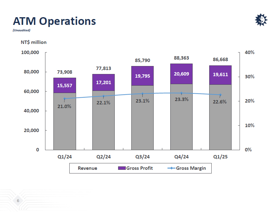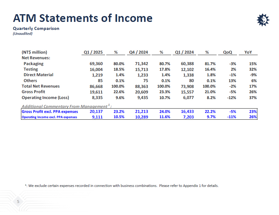 ATM Statements of Income Quarterly Comparison (Unaudited) 5 (NT$ million) Q1 / 2025 % Q4 / 2024 % Q1 / 2024 % QoQ YoY Net Revenues: Packaging 69,360 80.0% 71,342 80.7% 60,388 81.7% -3% 15% Testing 16,004 18.5% 15,713 17.8% 12,102 16.4% 2% 32% Direct Material 1,219 1.4% 1,233 1.4% 1,338 1.8% -1% -9% Others 85 0.1% 75 0.1% 80 0.1% 13% 6% Total Net Revenues 86,668 100.0% 88,363 100.0% 73,908 100.0% -2% 17% Gross Profit 19,611 22.6% 20,609 23.3% 15,557 21.0% -5% 26% Operating Income (Loss) 8,335 9.6% 9,435 10.7% 6,077 8.2% -12% 37% Additional Commentary From Management 1 : Gross Profit excl. PPA expenses 20,137 23.2% 21,213 24.0% 16,433 22.2% -5% 23% Operating Income excl. PPA expenses 9,111 10.5% 10,289 11.6% 7,203 9.7% -11% 26% 1 : We exclude certain expenses recorded in connection with business combinations. Please refer to Appendix 1 for details.