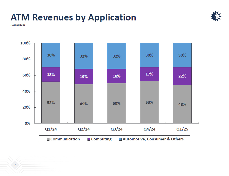 ATM Operations (Unaudited) 6 15,557 17,201 19,795 20,609 19,611 73,908 77,813 85,790 88,363 86,668 21.0% 22.1% 23.1% 23.3% 22.6% 0% 10% 20% 30% 40% 0 20,000 40,000 60,000 80,000 100,000 Q1/24 Q2/24 Q3/24 Q4/24 Q1/25 NT$ million Gross Profit Gross Margin Revenue