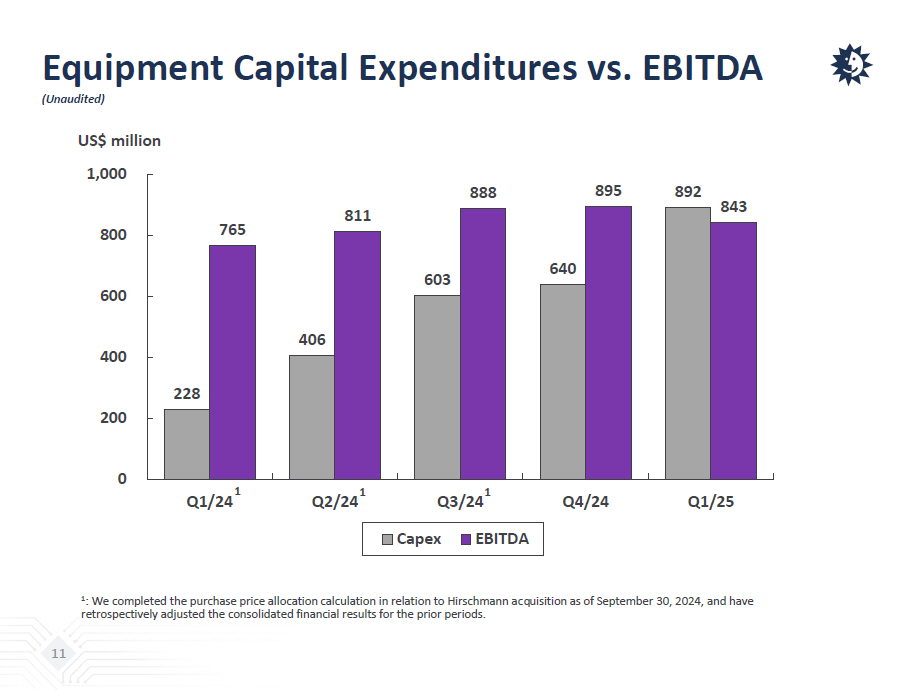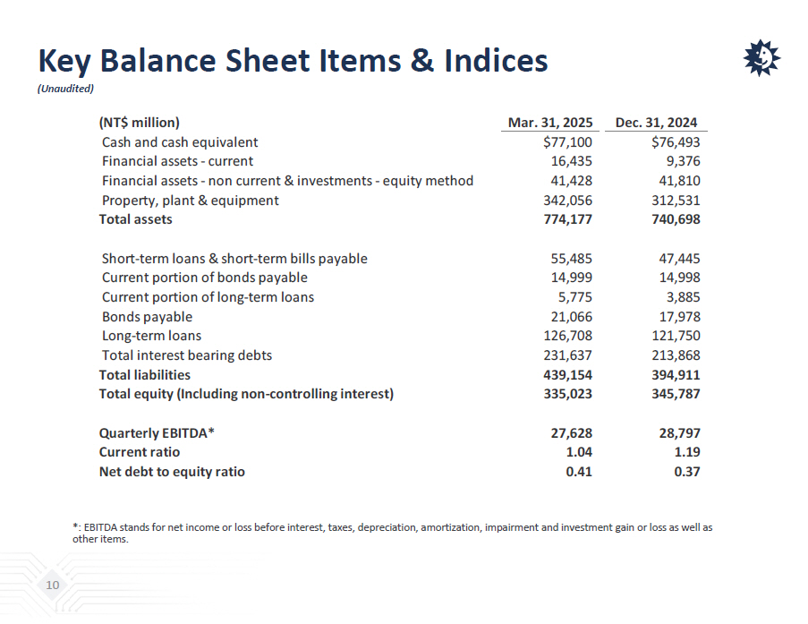 Key Balance Sheet Items & Indices (Unaudited) 10 (NT$ million) Mar. 31, 2025 Dec. 31, 2024 Cash and cash equivalent $77,100 $76,493 Financial assets - current 16,435 9,376 Financial assets - non current & investments - equity method 41,428 41,810 Property, plant & equipment 342,056 312,531 Total assets 774,177 740,698 Short-term loans & short-term bills payable 55,485 47,445 Current portion of bonds payable 14,999 14,998 Current portion of long-term loans 5,775 3,885 Bonds payable 21,066 17,978 Long-term loans 126,708 121,750 Total interest bearing debts 231,637 213,868 Total liabilities 439,154 394,911 Total equity (Including non-controlling interest) 335,023 345,787 Quarterly EBITDA* 27,628 28,797 Current ratio 1.04 1.19 Net debt to equity ratio 0.41 0.37 *: EBITDA stands for net income or loss before interest, taxes, depreciation, amortization, impairment and investment gain or lo ss as well as other items .