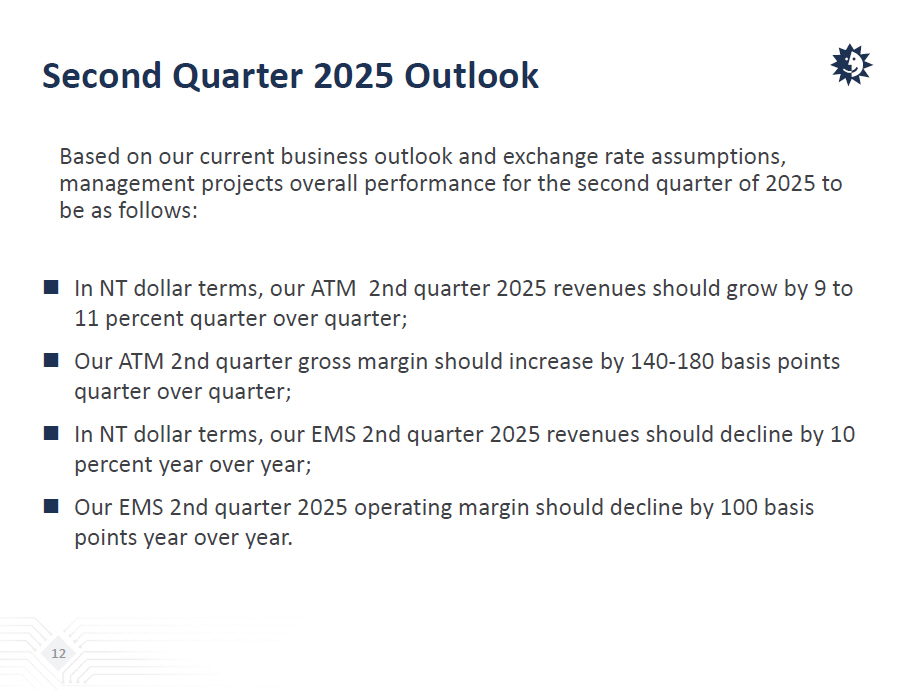 Second Quarter 2025 Outlook Based on our current business outlook and exchange rate assumptions, management projects overall performance for the second quarter of 2025 to be as follows:  In NT dollar terms, our ATM 2nd quarter 2025 revenues should grow by 9 to 11 percent quarter over quarter;  Our ATM 2nd quarter gross margin should increase by 140 - 180 basis points quarter over quarter;  In NT dollar terms, our EMS 2nd quarter 2025 revenues should decline by 10 percent year over year;  Our EMS 2nd quarter 2025 operating margin should decline by 100 basis points year over year. 12