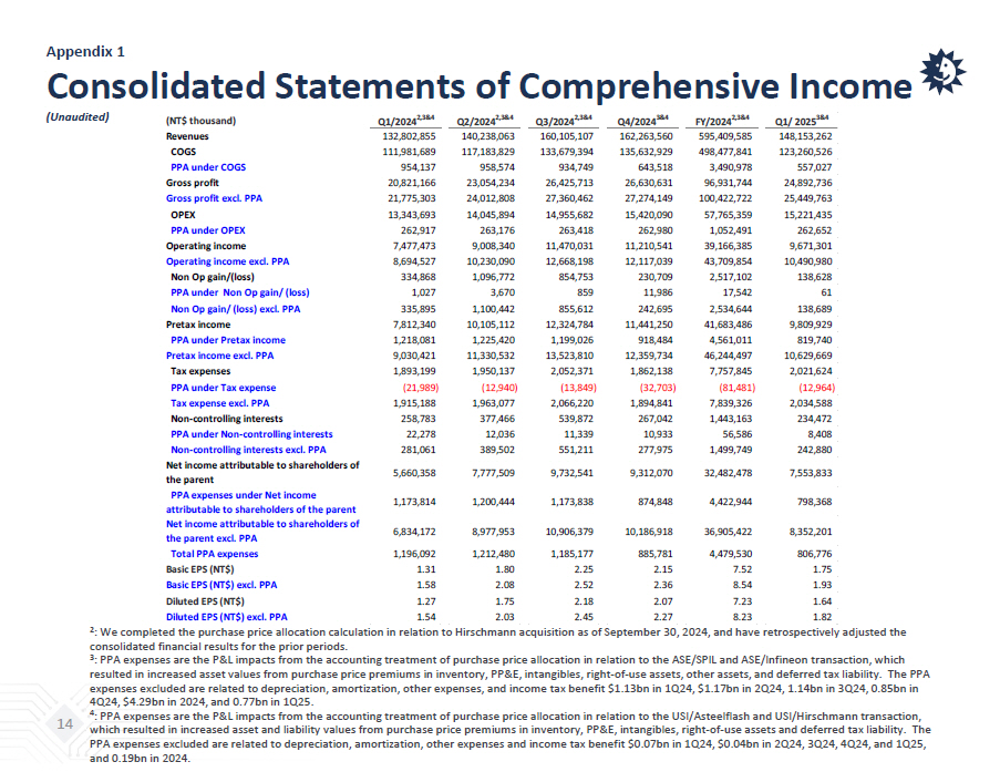 Appendix 1 Consolidated Statements of Comprehensive Income (Unaudited) 14 (NT$ thousand) Q1/2024 2,3&4 Q2/2024 2,3&4 Q3/2024 2,3&4 Q4/2024 3&4 FY/2024 2,3&4 Q1/ 2025 3&4 Revenues 132,802,855 140,238,063 160,105,107 162,263,560 595,409,585 148,153,262 COGS 111,981,689 117,183,829 133,679,394 135,632,929 498,477,841 123,260,526 PPA under COGS 954,137 958,574 934,749 643,518 3,490,978 557,027 Gross profit 20,821,166 23,054,234 26,425,713 26,630,631 96,931,744 24,892,736 Gross profit excl. PPA 21,775,303 24,012,808 27,360,462 27,274,149 100,422,722 25,449,763 OPEX 13,343,693 14,045,894 14,955,682 15,420,090 57,765,359 15,221,435 PPA under OPEX 262,917 263,176 263,418 262,980 1,052,491 262,652 Operating income 7,477,473 9,008,340 11,470,031 11,210,541 39,166,385 9,671,301 Operating income excl. PPA 8,694,527 10,230,090 12,668,198 12,117,039 43,709,854 10,490,980 Non Op gain/(loss) 334,868 1,096,772 854,753 230,709 2,517,102 138,628 PPA under Non Op gain/ (loss) 1,027 3,670 859 11,986 17,542 61 Non Op gain/ (loss) excl. PPA 335,895 1,100,442 855,612 242,695 2,534,644 138,689 Pretax income 7,812,340 10,105,112 12,324,784 11,441,250 41,683,486 9,809,929 PPA under Pretax income 1,218,081 1,225,420 1,199,026 918,484 4,561,011 819,740 Pretax income excl. PPA 9,030,421 11,330,532 13,523,810 12,359,734 46,244,497 10,629,669 Tax expenses 1,893,199 1,950,137 2,052,371 1,862,138 7,757,845 2,021,624 PPA under Tax expense (21,989) (12,940) (13,849) (32,703) (81,481) (12,964) Tax expense excl. PPA 1,915,188 1,963,077 2,066,220 1,894,841 7,839,326 2,034,588 Non-controlling interests 258,783 377,466 539,872 267,042 1,443,163 234,472 PPA under Non-controlling interests 22,278 12,036 11,339 10,933 56,586 8,408 Non-controlling interests excl. PPA 281,061 389,502 551,211 277,975 1,499,749 242,880 Net income attributable to shareholders of the parent 5,660,358 7,777,509 9,732,541 9,312,070 32,482,478 7,553,833 PPA expenses under Net income attributable to shareholders of the parent 1,173,814 1,200,444 1,173,838 874,848 4,422,944 798,368 Net income attributable to shareholders of the parent excl. PPA 6,834,172 8,977,953 10,906,379 10,186,918 36,905,422 8,352,201 Total PPA expenses 1,196,092 1,212,480 1,185,177 885,781 4,479,530 806,776 Basic EPS (NT$) 1.31 1.80 2.25 2.15 7.52 1.75 Basic EPS (NT$) excl. PPA 1.58 2.08 2.52 2.36 8.54 1.93 Diluted EPS (NT$) 1.27 1.75 2.18 2.07 7.23 1.64 Diluted EPS (NT$) excl. PPA 1.54 2.03 2.45 2.27 8.23 1.82 2 : We completed the purchase price allocation calculation in relation to Hirschmann acquisition as of September 30, 2024, and have retrospectively adjusted the consolidated financial results for the prior periods. 3 : PPA expenses are the P&L impacts from the accounting treatment of purchase price allocation in relation to the ASE/SPIL and ASE/Infineon transaction , which resulted in increased asset values from purchase price premiums in inventory, PP&E, intangibles, right - of - use assets, other assets, and deferred tax liability. The PPA expenses excluded are related to depreciation, amortization, other expenses, and income tax benefit $1.13bn in 1Q24, $1.17bn in 2Q24, 1.14bn in 3Q24, 0.85bn in 4Q24, $4.29bn in 2024, and 0.77bn in 1Q25. 4 : PPA expenses are the P&L impacts from the accounting treatment of purchase price allocation in relation to the USI/ Asteelflash and USI/ Hirschmann transaction, which resulted in increased asset and liability values from purchase price premiums in inventory, PP&E, intangibles, right - of - us e assets and deferred tax liability. The PPA expenses excluded are related to depreciation, amortization, other expenses and income tax benefit $0.07bn in 1Q24, $0.04 bn in 2Q24, 3Q24, 4Q24, and 1Q25, and 0.19bn in 2024.