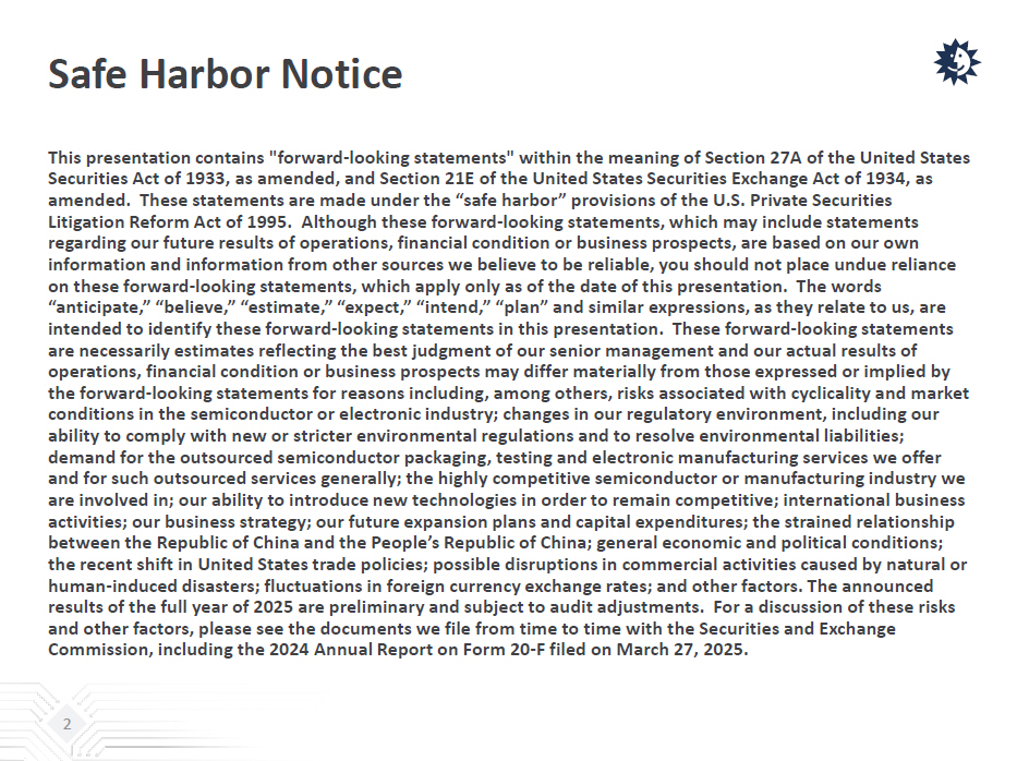 Safe Harbor Notice This presentation contains "forward - looking statements" within the meaning of Section 27A of the United States Securities Act of 1933, as amended, and Section 21E of the United States Securities Exchange Act of 1934, as amended. These statements are made under the “safe harbor” provisions of the U.S. Private Securities Litigation Reform Act of 1995. Although these forward - looking statements, which may include statements regarding our future results of operations, financial condition or business prospects, are based on our own information and information from other sources we believe to be reliable, you should not place undue reliance on these forward - looking statements, which apply only as of the date of this presentation. The words “anticipate,” “believe,” “estimate,” “expect,” “intend,” “plan” and similar expressions, as they relate to us, are intended to identify these forward - looking statements in this presentation. These forward - looking statements are necessarily estimates reflecting the best judgment of our senior management and our actual results of operations, financial condition or business prospects may differ materially from those expressed or implied by the forward - looking statements for reasons including, among others, risks associated with cyclicality and market conditions in the semiconductor or electronic industry; changes in our regulatory environment, including our ability to comply with new or stricter environmental regulations and to resolve environmental liabilities; demand for the outsourced semiconductor packaging, testing and electronic manufacturing services we offer and for such outsourced services generally; the highly competitive semiconductor or manufacturing industry we are involved in; our ability to introduce new technologies in order to remain competitive; international business activities; our business strategy; our future expansion plans and capital expenditures; the strained relationship between the Republic of China and the People’s Republic of China; general economic and political conditions; the recent shift in United States trade policies; possible disruptions in commercial activities caused by natural or human - induced disasters; fluctuations in foreign currency exchange rates; and other factors. The announced results of the full year of 2025 are preliminary and subject to audit adjustments. For a discussion of these risks and other factors, please see the documents we file from time to time with the Securities and Exchange Commission, including the 2024 Annual Report on Form 20 - F filed on March 27, 2025. 2