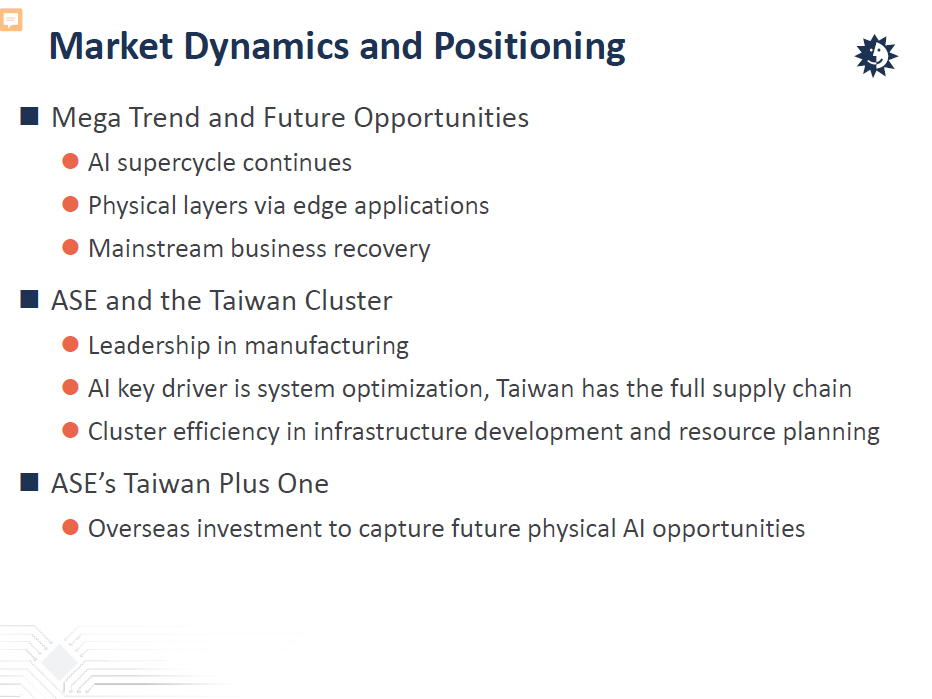 Market Dynamics and Positioning  Mega Trend and Future Opportunities  AI supercycle continues  Physical layers via edge applications  Mainstream business recovery  ASE and the Taiwan Cluster  Leadership in manufacturing  AI key driver is system optimization, Taiwan has the full supply chain  Cluster efficiency in infrastructure development and resource planning  ASE’s Taiwan Plus One  Overseas investment to capture future physical AI opportunities