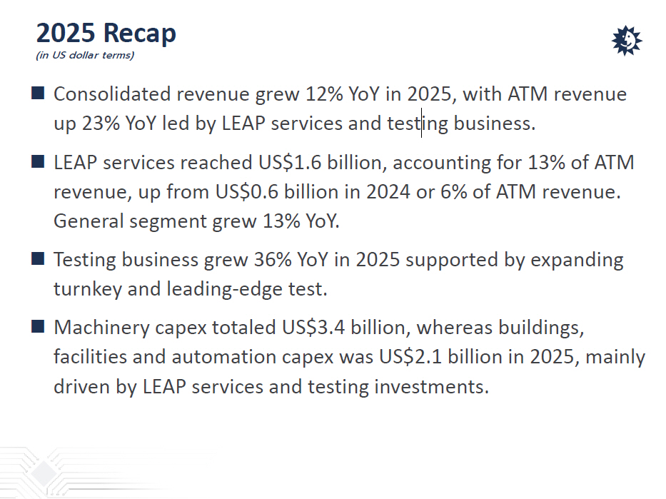 2025 Recap (in US dollar terms)  Consolidated revenue grew 12% YoY in 2025, with ATM revenue up 23% YoY led by LEAP services and testing business.  LEAP services reached US$1.6 billion, accounting for 13% of ATM revenue, up from US$0.6 billion in 2024 or 6% of ATM revenue. General segment grew 13% YoY.  Testing business grew 36% YoY in 2025 supported by expanding turnkey and leading - edge test.  Machinery capex totaled US$3.4 billion, whereas buildings, facilities and automation capex was US$2.1 billion in 2025, mainly driven by LEAP services and testing investments.