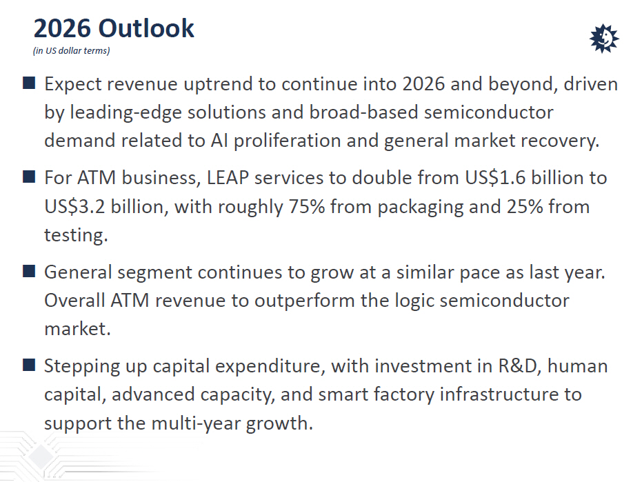 2026 Outlook (in US dollar terms)  Expect revenue uptrend to continue into 2026 and beyond, driven by leading - edge solutions and broad - based semiconductor demand related to AI proliferation and general market recovery.  For ATM business, LEAP services to double from US$1.6 billion to US$3.2 billion, with roughly 75% from packaging and 25% from testing.  General segment continues to grow at a similar pace as last year. Overall ATM revenue to outperform the logic semiconductor market.  Stepping up capital expenditure, with investment in R&D, human capital, advanced capacity, and smart factory infrastructure to support the multi - year growth.
