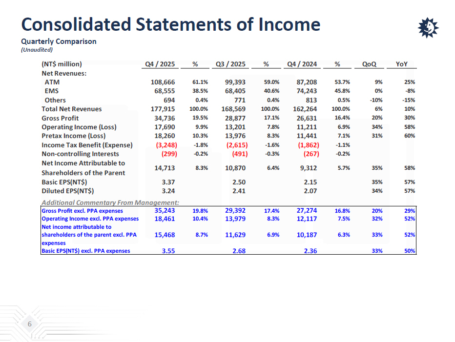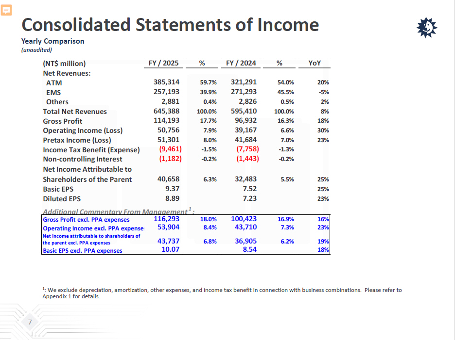 Consolidated Statements of Income Yearly Comparison (unaudited) (NT$ million) FY / 2025 % FY / 2024 % YoYNet Revenues: ATM 385,314 59.7% 321,291 54.0% 20% EMS 257,193 39.9% 271,293 45.5% -5% Others 2,881 0.4% 2,826 0.5% 2% Total Net Revenues 645,388 100.0% 595,410 100.0% 8% Gross Profit 114,193 17.7% 96,932 16.3% 18% Operating Income (Loss) 50,756 7.9% 39,167 6.6% 30% Pretax Income (Loss) 51,301 8.0% 41,684 7.0% 23% Income Tax Benefit (Expense) (9,461) -1.5% (7,758) -1.3% Non-controlling Interest (1,182) -0.2% (1,443) -0.2% Net Income Attributable to Shareholders of the Parent 40,658 6.3% 32,483 5.5% 25% Basic EPS 9.37 7.52 25% Diluted EPS 8.89 7.23 23% Additional Commentary From Management 1 : Gross Profit excl. PPA expenses 116,293 18.0% 100,423 16.9% 16% Operating Income excl. PPA expenses 53,904 8.4% 43,710 7.3% 23% Net income attributable to shareholders of the parent excl. PPA expenses 43,737 6.8% 36,905 6.2% 19% Basic EPS excl. PPA expenses 10.07 8.54 18% 1 : We exclude depreciation, amortization, other expenses, and income tax benefit in connection with business combinations. Pl eas e refer to Appendix 1 for details. 7