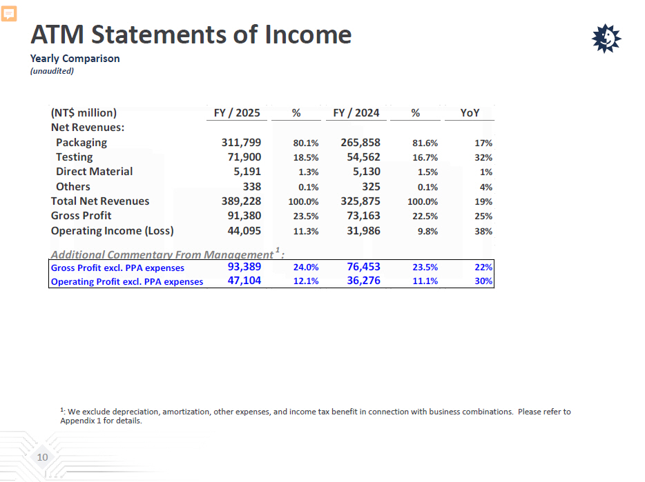 ATM Statements of Income Quarterly Comparison (Unaudited) 9 (NT$ million) Q4 / 2025 % Q3 / 2025 % Q4 / 2024 % QoQ YoY Net Revenues: Packaging 87,397 79.7% 80,602 80.4% 71,342 80.7% 8% 23% Testing 20,863 19.0% 18,420 18.3% 15,713 17.8% 13% 33% Direct Material 1,352 1.2% 1,190 1.2% 1,233 1.4% 14% 10% Others 95 0.1% 77 0.1% 75 0.1% 23% 27% Total Net Revenues 109,707 100.0% 100,289 100.0% 88,363 100.0% 9% 24% Gross Profit 28,824 26.3% 22,697 22.6% 20,609 23.3% 27% 40% Operating Income (Loss) 16,081 14.7% 10,862 10.8% 9,435 10.7% 48% 70% Additional Commentary From Management: Gross Profit excl. PPA expenses 29,315 26.7% 23,187 23.1% 21,213 24.0% 26% 38% Operating Income excl. PPA expenses 16,822 15.3% 11,602 11.6% 10,289 11.6% 45% 63%