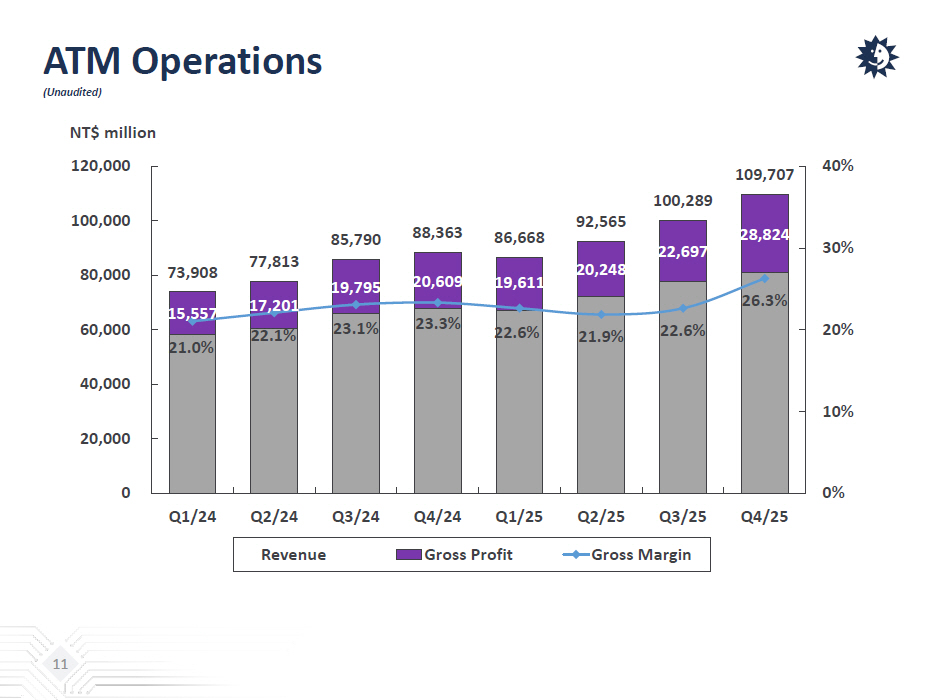 ATM Statements of Income Yearly Comparison (unaudited) (NT$ million) FY / 2025 % FY / 2024 % YoYNet Revenues: Packaging 311,799 80.1% 265,858 81.6% 17% Testing 71,900 18.5% 54,562 16.7% 32% Direct Material 5,191 1.3% 5,130 1.5% 1% Others 338 0.1% 325 0.1% 4% Total Net Revenues 389,228 100.0% 325,875 100.0% 19% Gross Profit 91,380 23.5% 73,163 22.5% 25% Operating Income (Loss) 44,095 11.3% 31,986 9.8% 38% Additional Commentary From Management 1 : Gross Profit excl. PPA expenses 93,389 24.0% 76,453 23.5% 22% Operating Profit excl. PPA expenses 47,104 12.1% 36,276 11.1% 30% 10 1 : We exclude depreciation, amortization, other expenses, and income tax benefit in connection with business combinations. Pl eas e refer to Appendix 1 for details.
