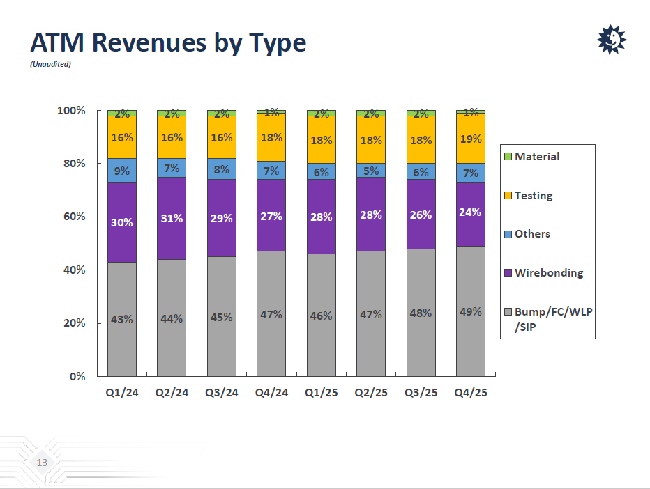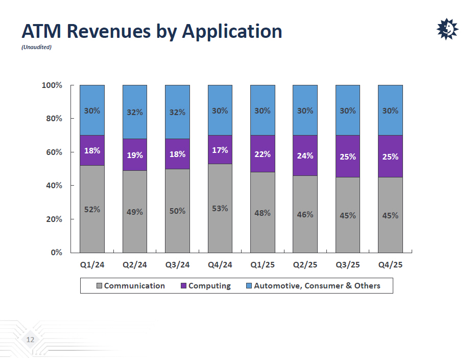ATM Revenues by Application (Unaudited) 12 52% 49% 50% 53% 48% 46% 45% 45% 18% 19% 18% 17% 22% 24% 25% 25% 30% 32% 32% 30% 30% 30% 30% 30% 0% 20% 40% 60% 80% 100% Q1/24 Q2/24 Q3/24 Q4/24 Q1/25 Q2/25 Q3/25 Q4/25 Communication Computing Automotive, Consumer & Others