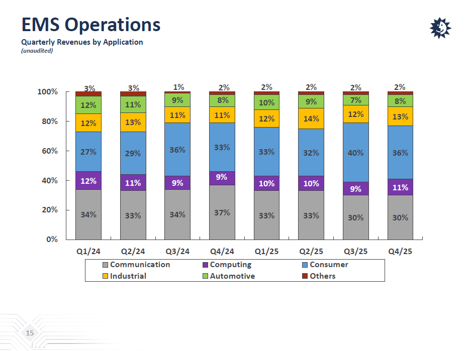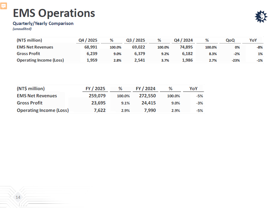 EMS Operations Quarterly/Yearly Comparison (unaudited) (NT$ million) Q4 / 2025 % Q3 / 2025 % Q4 / 2024 % QoQ YoY EMS Net Revenues 68,991 100.0% 69,022 100.0% 74,895 100.0% 0% -8% Gross Profit 6,239 9.0% 6,379 9.2% 6,182 8.3% -2% 1% Operating Income (Loss) 1,959 2.8% 2,541 3.7% 1,986 2.7% -23% -1% (NT$ million) FY / 2025 % FY / 2024 % YoY EMS Net Revenues 259,079 100.0% 272,550 100.0% -5% Gross Profit 23,695 9.1% 24,415 9.0% -3% Operating Income (Loss) 7,622 2.9% 7,990 2.9% -5% 14