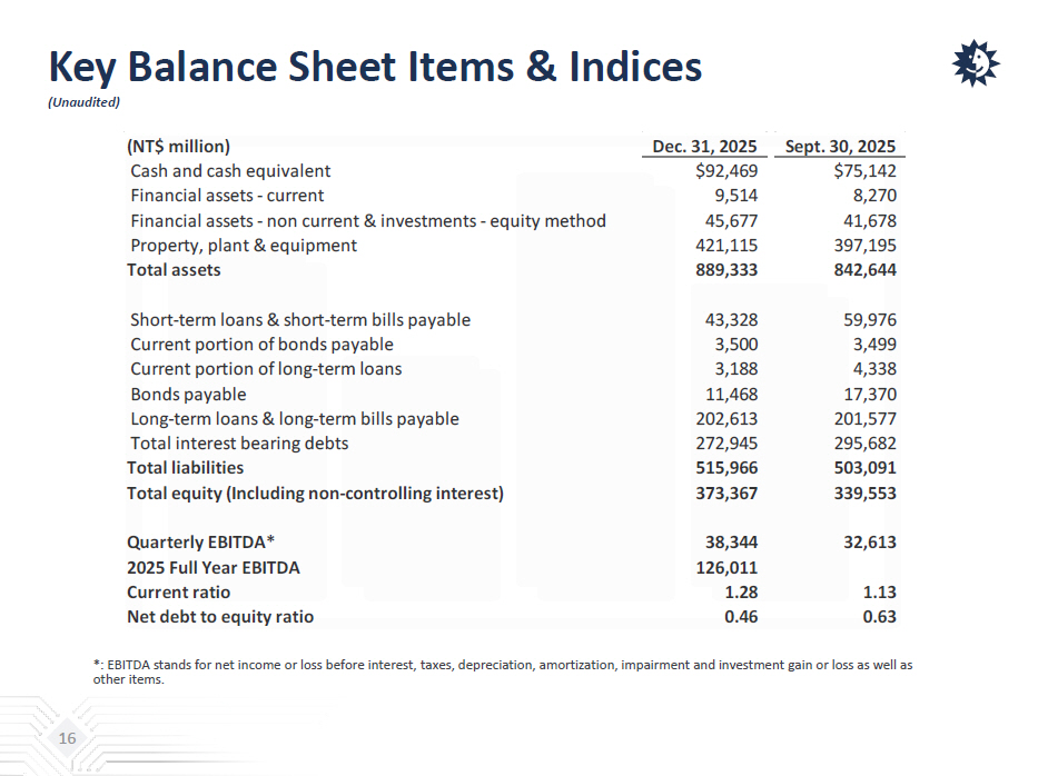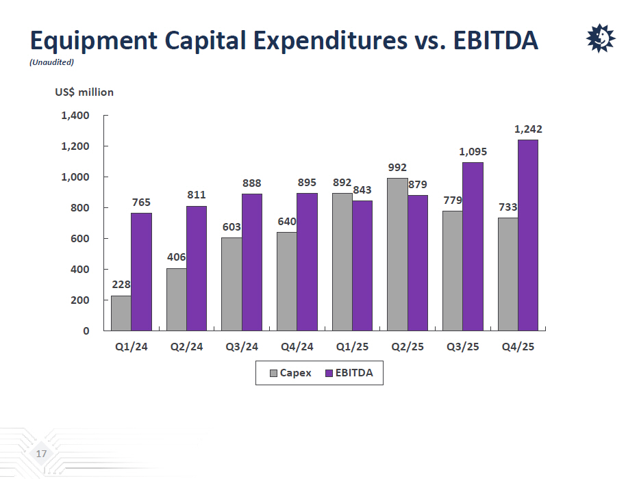 Key Balance Sheet Items & Indices (Unaudited) 16 *: EBITDA stands for net income or loss before interest, taxes, depreciation, amortization, impairment and investment gain or lo ss as well as other items. (NT$ million) Dec. 31, 2025 Sept. 30, 2025 Cash and cash equivalent $92,469 $75,142 Financial assets - current 9,514 8,270 Financial assets - non current & investments - equity method 45,677 41,678 Property, plant & equipment 421,115 397,195 Total assets 889,333 842,644 Short-term loans & short-term bills payable 43,328 59,976 Current portion of bonds payable 3,500 3,499 Current portion of long-term loans 3,188 4,338 Bonds payable 11,468 17,370 Long-term loans & long-term bills payable 202,613 201,577 Total interest bearing debts 272,945 295,682 Total liabilities 515,966 503,091 Total equity (Including non-controlling interest) 373,367 339,553 Quarterly EBITDA* 38,344 32,613 2025 Full Year EBITDA 126,011 Current ratio 1.28 1.13 Net debt to equity ratio 0.46 0.63