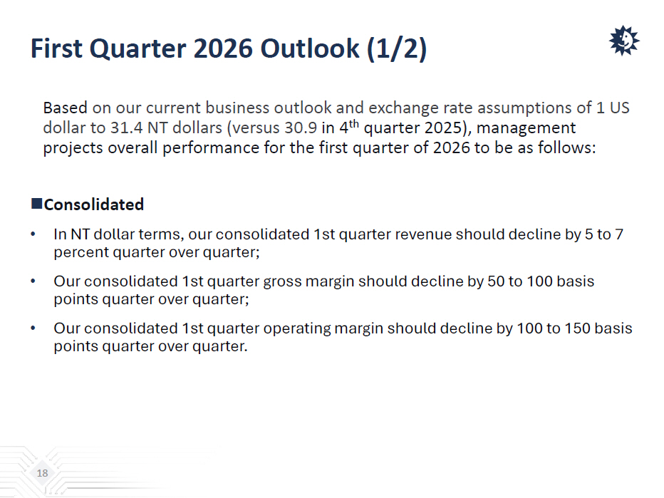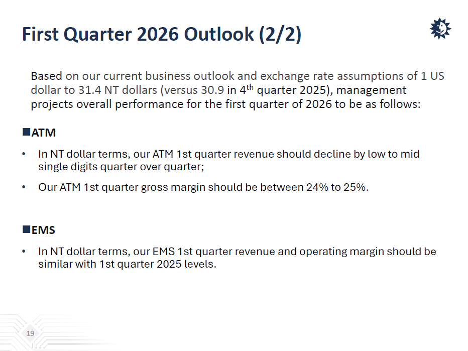 First Quarter 2026 Outlook (1/2) Based on our current business outlook and exchange rate assumptions of 1 US dollar to 31 .4 NT dollars (versus 30.9 in 4 th quarter 2025) , management projects overall performance for the first quarter of 2026 to be as follows:  Consolidated • In NT dollar terms, our consolidated 1st quarter revenue should decline by 5 to 7 percent quarter over quarter; • Our consolidated 1st quarter gross margin should decline by 50 to 100 basis points quarter over quarter; • Our consolidated 1st quarter operating margin should decline by 100 to 150 basis points quarter over quarter. 18