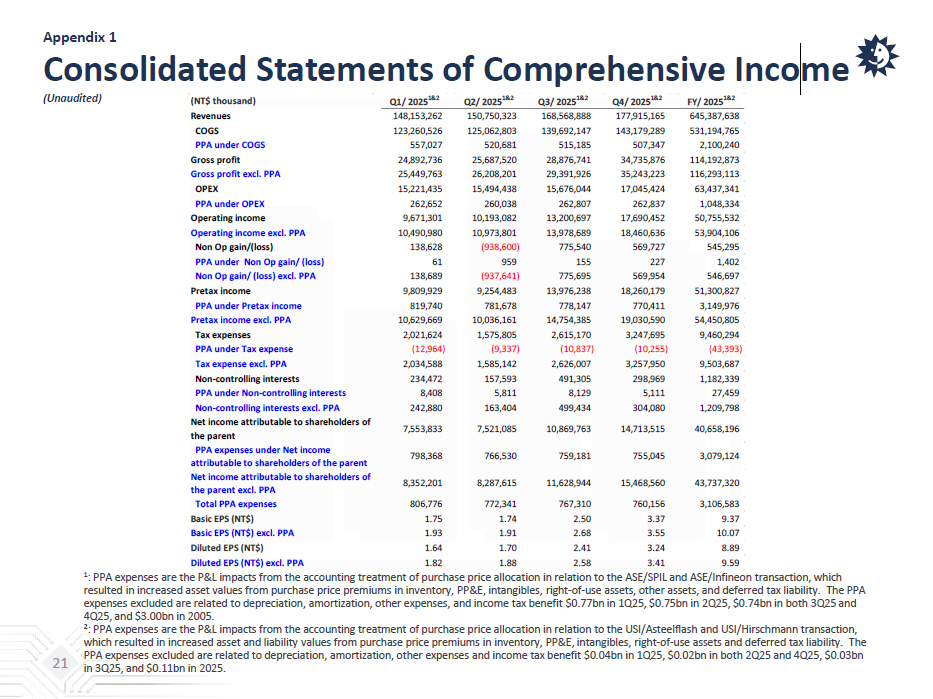 Appendix 1 Consolidated Statements of Comprehensive Income (Unaudited) 21 (NT$ thousand) Q1/ 2025 1&2 Q2/ 2025 1&2 Q3/ 2025 1&2 Q4/ 2025 1&2 FY/ 2025 1&2 Revenues 148,153,262 150,750,323 168,568,888 177,915,165 645,387,638 COGS 123,260,526 125,062,803 139,692,147 143,179,289 531,194,765 PPA under COGS 557,027 520,681 515,185 507,347 2,100,240 Gross profit 24,892,736 25,687,520 28,876,741 34,735,876 114,192,873 Gross profit excl. PPA 25,449,763 26,208,201 29,391,926 35,243,223 116,293,113 OPEX 15,221,435 15,494,438 15,676,044 17,045,424 63,437,341 PPA under OPEX 262,652 260,038 262,807 262,837 1,048,334 Operating income 9,671,301 10,193,082 13,200,697 17,690,452 50,755,532 Operating income excl. PPA 10,490,980 10,973,801 13,978,689 18,460,636 53,904,106 Non Op gain/(loss) 138,628 (938,600) 775,540 569,727 545,295 PPA under Non Op gain/ (loss) 61 959 155 227 1,402 Non Op gain/ (loss) excl. PPA 138,689 (937,641) 775,695 569,954 546,697 Pretax income 9,809,929 9,254,483 13,976,238 18,260,179 51,300,827 PPA under Pretax income 819,740 781,678 778,147 770,411 3,149,976 Pretax income excl. PPA 10,629,669 10,036,161 14,754,385 19,030,590 54,450,805 Tax expenses 2,021,624 1,575,805 2,615,170 3,247,695 9,460,294 PPA under Tax expense (12,964) (9,337) (10,837) (10,255) (43,393) Tax expense excl. PPA 2,034,588 1,585,142 2,626,007 3,257,950 9,503,687 Non-controlling interests 234,472 157,593 491,305 298,969 1,182,339 PPA under Non-controlling interests 8,408 5,811 8,129 5,111 27,459 Non-controlling interests excl. PPA 242,880 163,404 499,434 304,080 1,209,798 Net income attributable to shareholders of the parent 7,553,833 7,521,085 10,869,763 14,713,515 40,658,196 PPA expenses under Net income attributable to shareholders of the parent 798,368 766,530 759,181 755,045 3,079,124 Net income attributable to shareholders of the parent excl. PPA 8,352,201 8,287,615 11,628,944 15,468,560 43,737,320 Total PPA expenses 806,776 772,341 767,310 760,156 3,106,583 Basic EPS (NT$) 1.75 1.74 2.50 3.37 9.37 Basic EPS (NT$) excl. PPA 1.93 1.91 2.68 3.55 10.07 Diluted EPS (NT$) 1.64 1.70 2.41 3.24 8.89 Diluted EPS (NT$) excl. PPA 1.82 1.88 2.58 3.41 9.59 1 : PPA expenses are the P&L impacts from the accounting treatment of purchase price allocation in relation to the ASE/SPIL and AS E/Infineon transaction, which resulted in increased asset values from purchase price premiums in inventory, PP&E, intangibles, right - of - use assets, other asse ts, and deferred tax liability. The PPA expenses excluded are related to depreciation, amortization, other expenses, and income tax benefit $0.77bn in 1Q25, $0.75bn in 2Q25, $0.74bn in both 3Q25 and 4Q25, and $3.00bn in 2005. 2 : PPA expenses are the P&L impacts from the accounting treatment of purchase price allocation in relation to the USI/ Asteelflash and USI/ Hirschmann transaction, which resulted in increased asset and liability values from purchase price premiums in inventory, PP&E, intangibles, right - of - us e assets and deferred tax liability. The PPA expenses excluded are related to depreciation, amortization, other expenses and income tax benefit $0.04bn in 1Q25, $0.02 bn in both 2Q25 and 4Q25, $0.03bn in 3Q25, and $0.11bn in 2025.